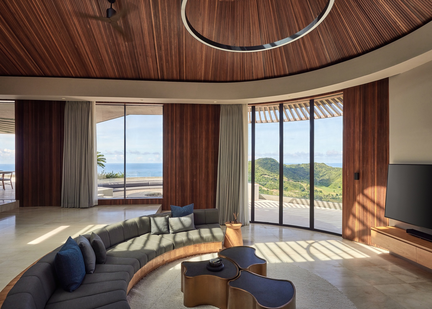 Above and around them, private wings for two families branch out, and a circular yoga platform crowns the very top, offering an unobstructed view across the bay.