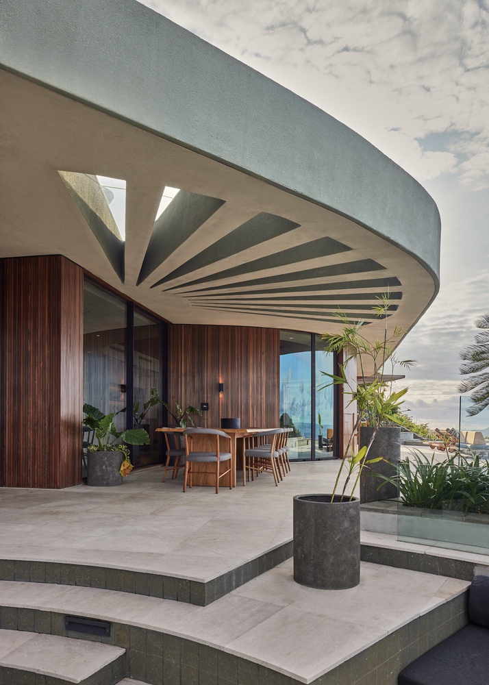 This descending sequence of forms echoes the curve of the coastline below. The architecture doesn't resist the steep terrain but works with it, gradually unfolding over multiple levels.