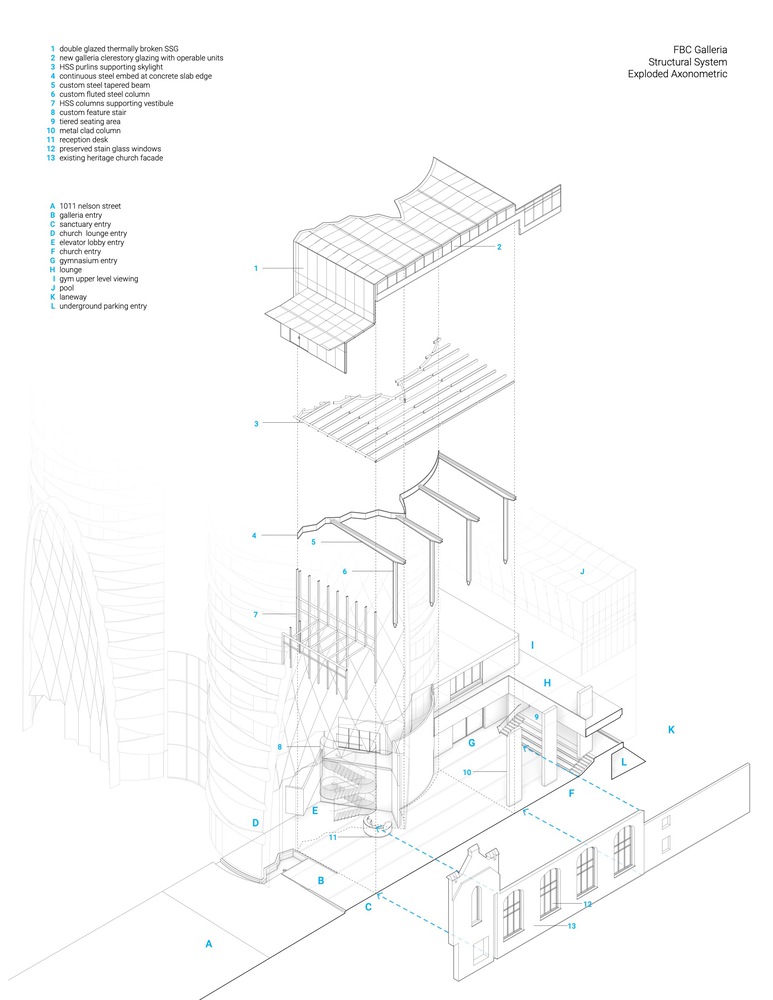 At the literal and conceptual center of the project is the galleria: a transparent, double-height atrium that links the heritage church with the tower podium.