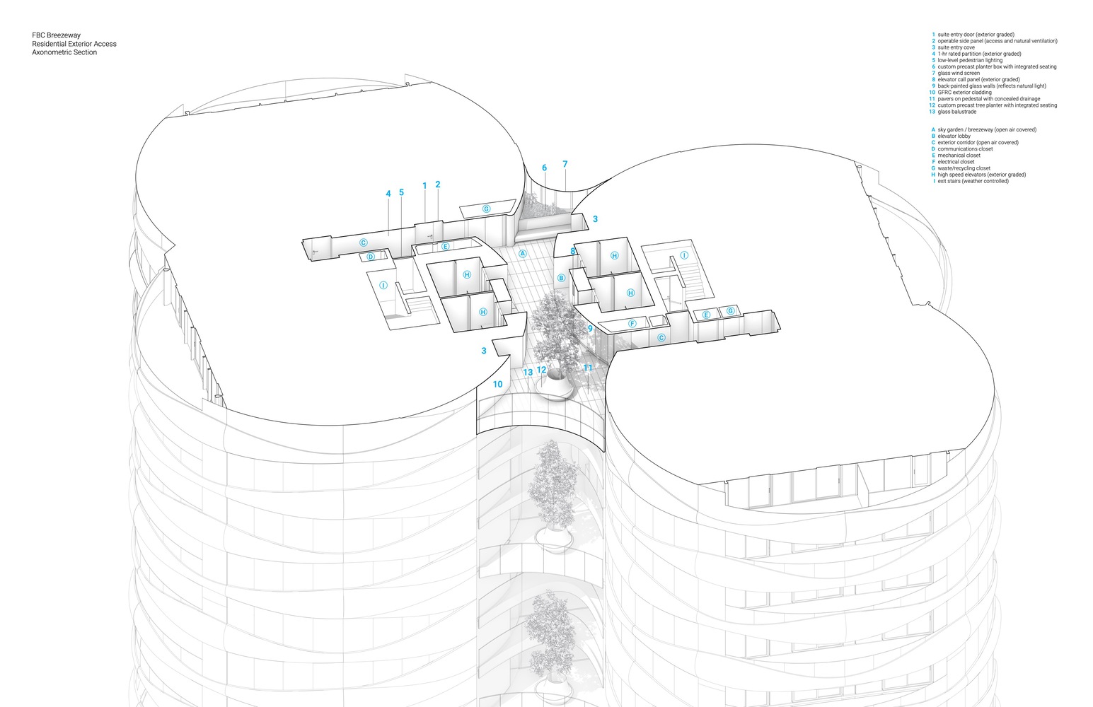 By splitting the floorplate, the architectural response draws fresh air and daylight up and through the tower in the form of breezeways at each level; the rounded form optimizes airflow, maximizes views, and minimizes shadow impact for the tower's neighbours.