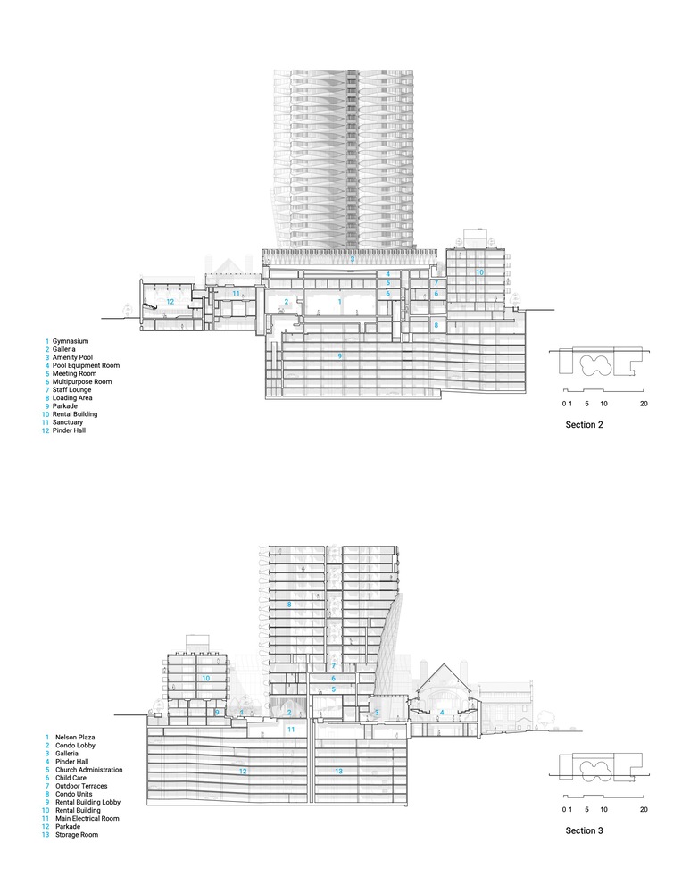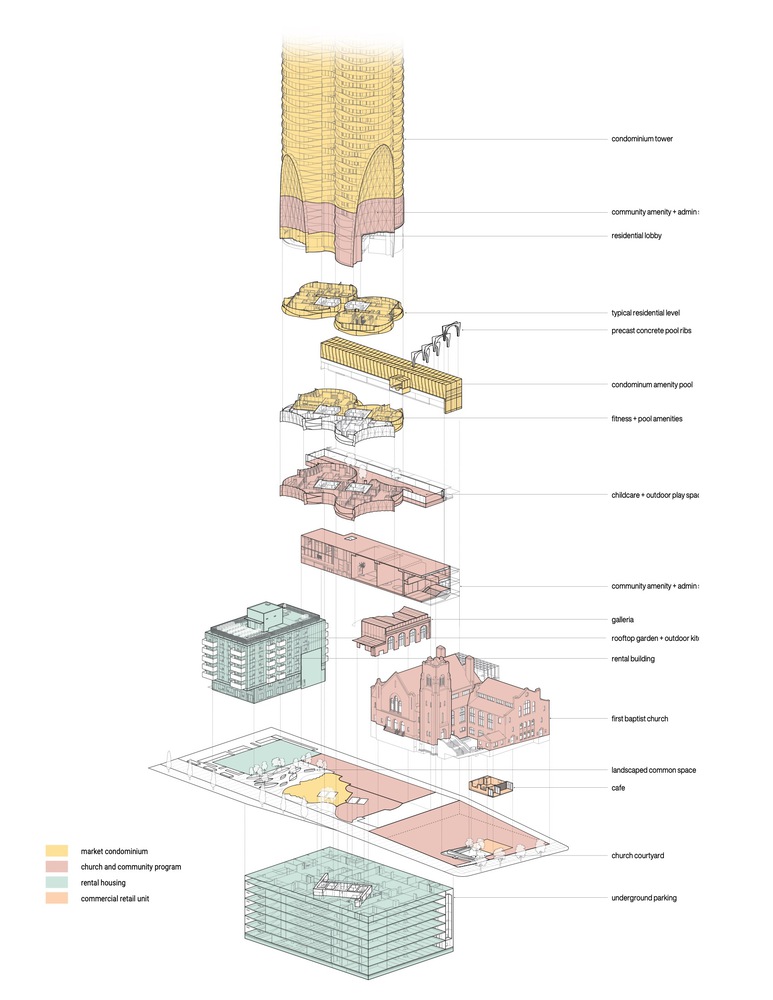 This collaboration between Revery, Westbank, and the First Baptist Church leverages church land as a mutually beneficial urban intervention that protects and elevates heritage, benefits the community, and delivers high-quality metropolitan living. Together, the church, tower, and mid-rise rental building form a layered urban landscape—part landmark, part living system.
