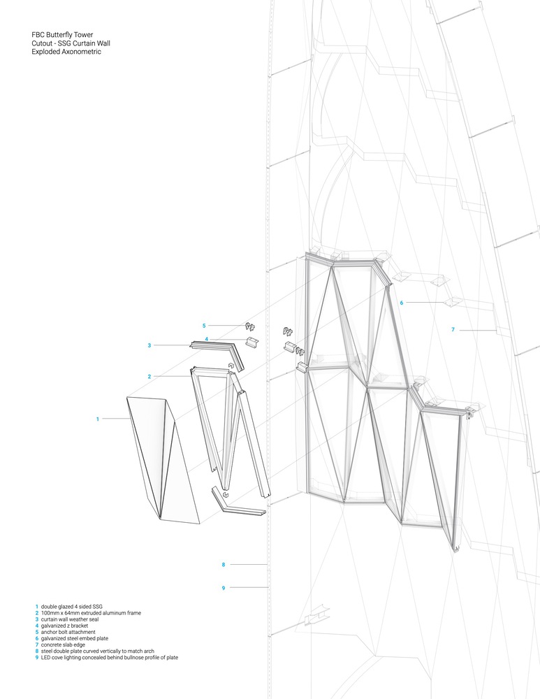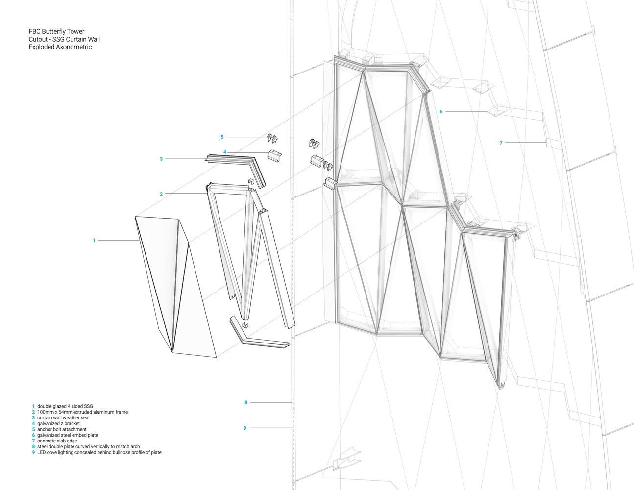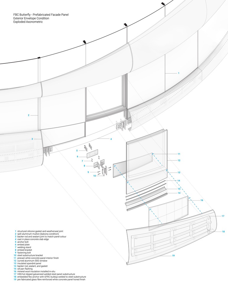 The Butterfly's undulating facade is realized through a highly complex envelope system that merges sculptural ambition with high performance. A dynamic A–B panel pattern defines each floor above level 14, made up of 24 prefabricated Glass Fiber Reinforced Concrete (GFRC) panels per band, 1,341 in total. These double-wythe panels integrate structure, insulation, waterproofing, and finish in a single assembly.