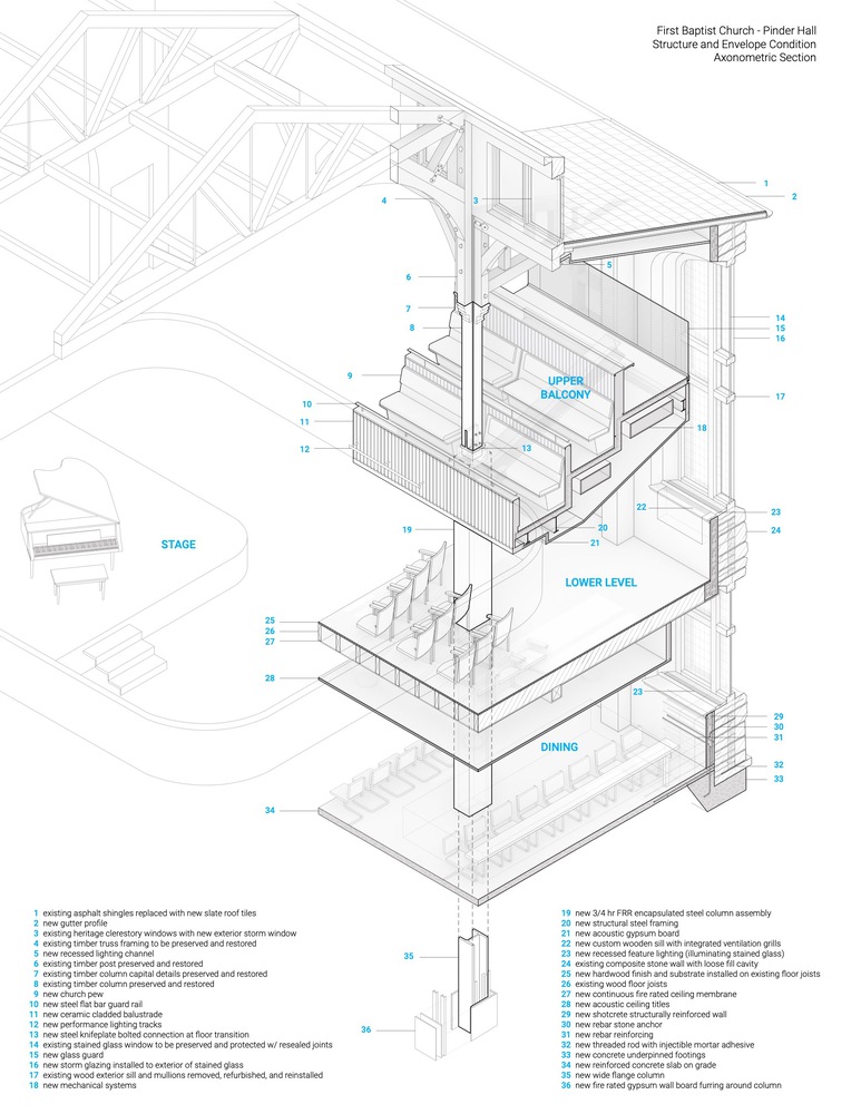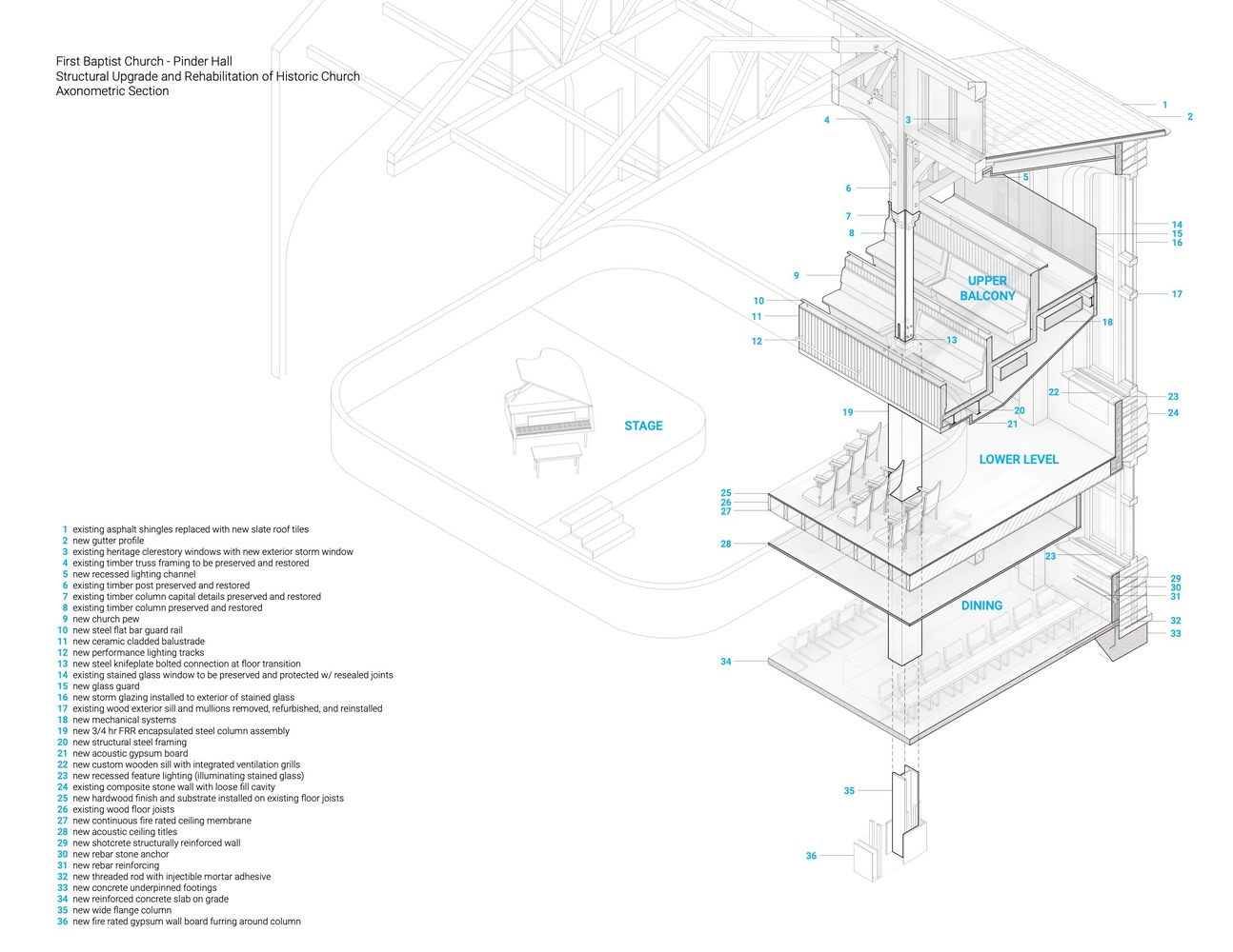 The restoration of First Baptist Church reinforces the environmental value of building reuse. Existing materials—masonry walls, timber framing, oak pews, and millwork—were carefully preserved, repaired, and re-integrated wherever possible.