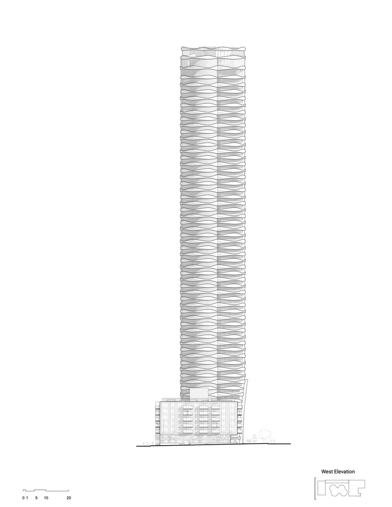 A water management strategy reduces potable water use by 50% and domestic water use by 35%, while promoting long-term resource conservation. The tower's curved massing optimizes views and daylight while minimizing overheating and shadow impact.