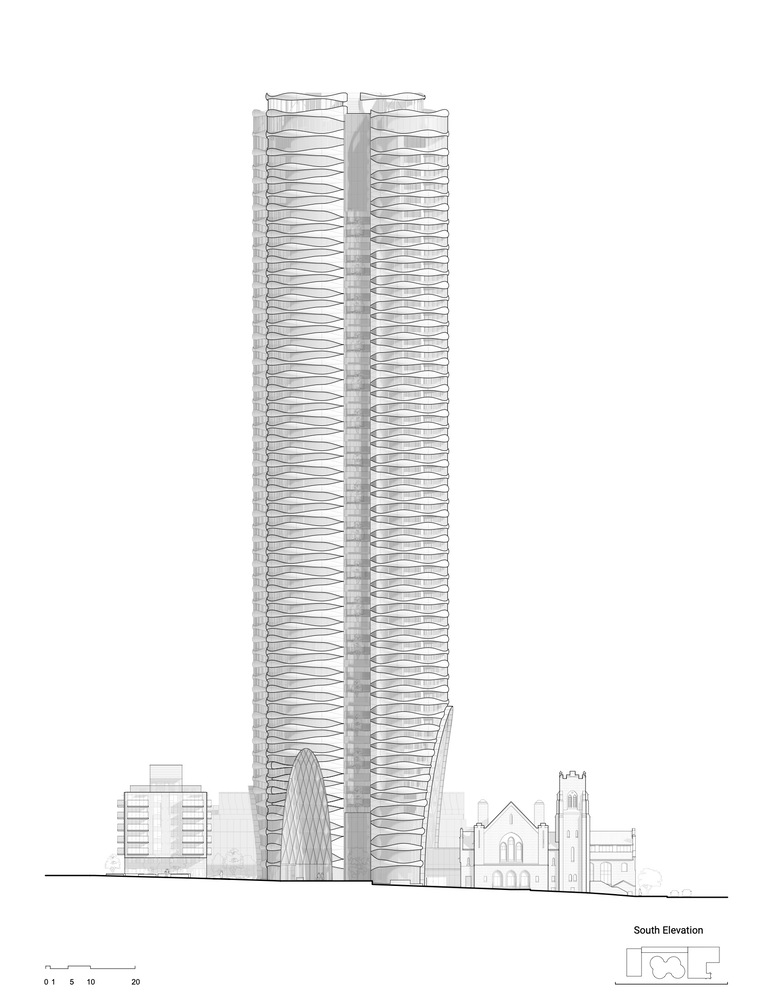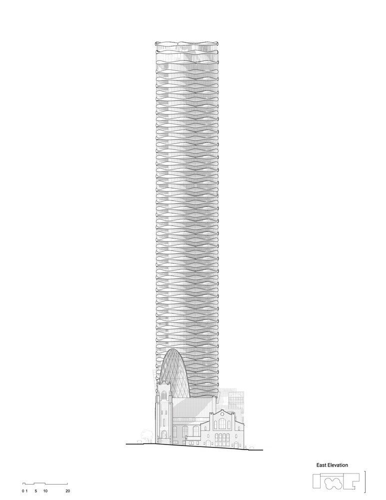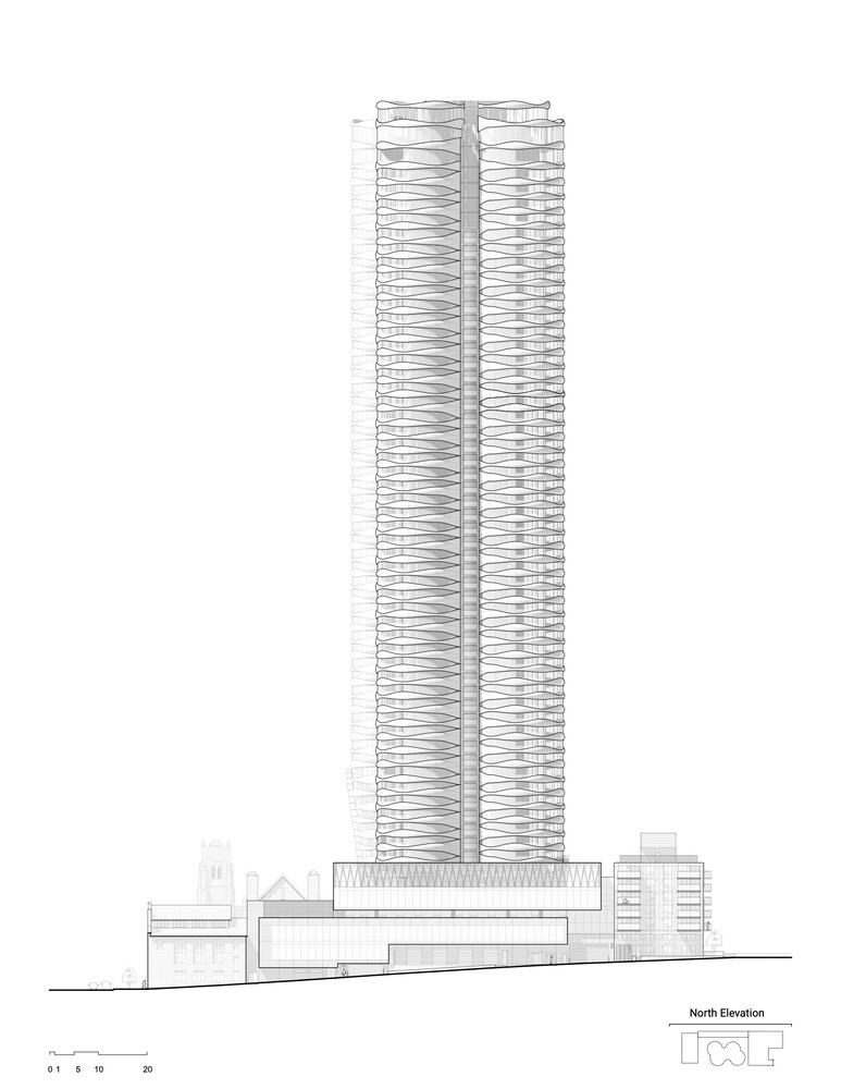 The undulating balconies and glazing dissolve as they meet in the tower's open core, the built form yielding to natural forces and abstracting the mutability of the sky. The tower's podium meets the ground plane in four parabolic chamfers that honour the historic church while also carving out public realm space and articulating the site's interconnected courtyards, plazas, and public spaces.