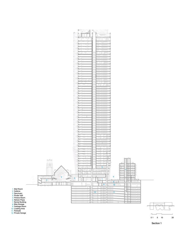 The 605,000-square-foot development integrates a restored Gothic Revival church, a rich network of community amenities, and an iconic 57-storey residential tower connected by a light-filled public gallery.