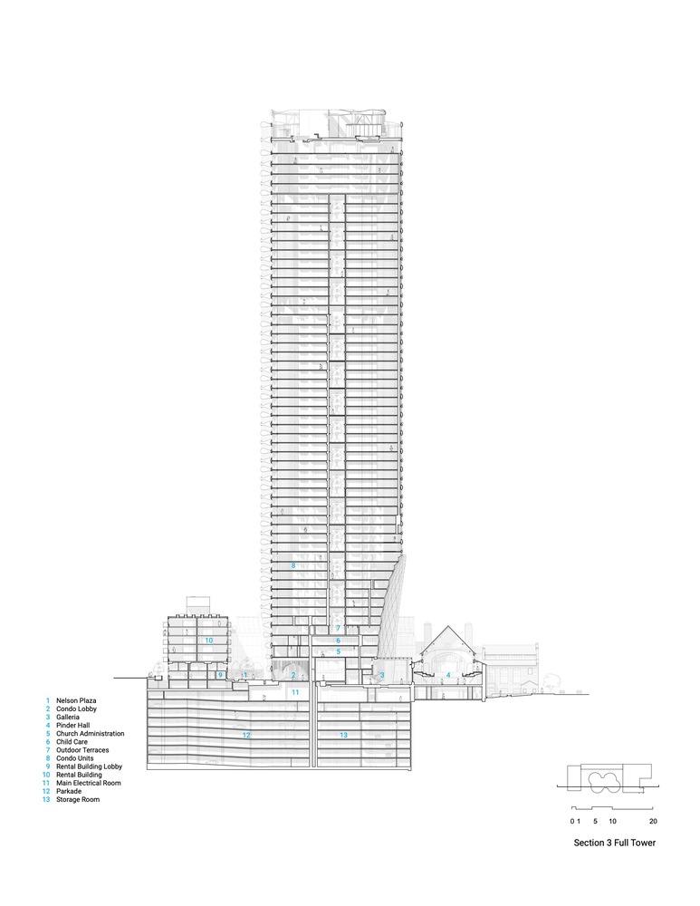Designed by Revery Architecture for Westbank Corp and the First Baptist Church of Vancouver, the 605,000 square-foot project combines an iconic 57-storey residential tower, a mid-rise social housing building, and the meticulous restoration and expansion of one of the city's most cherished Gothic Revival landmarks.