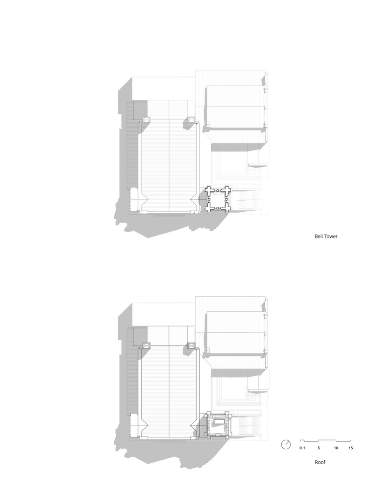 Its restrained steel and glass structure yields to the rough-hewn masonry of the church and the expressive curvilinearity of the tower, creating a dynamic space that brings to life a vibrant discourse between new/old, public/private, and interior/exterior.