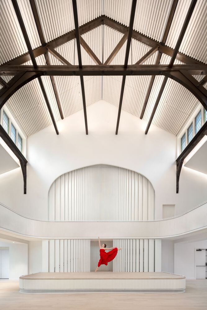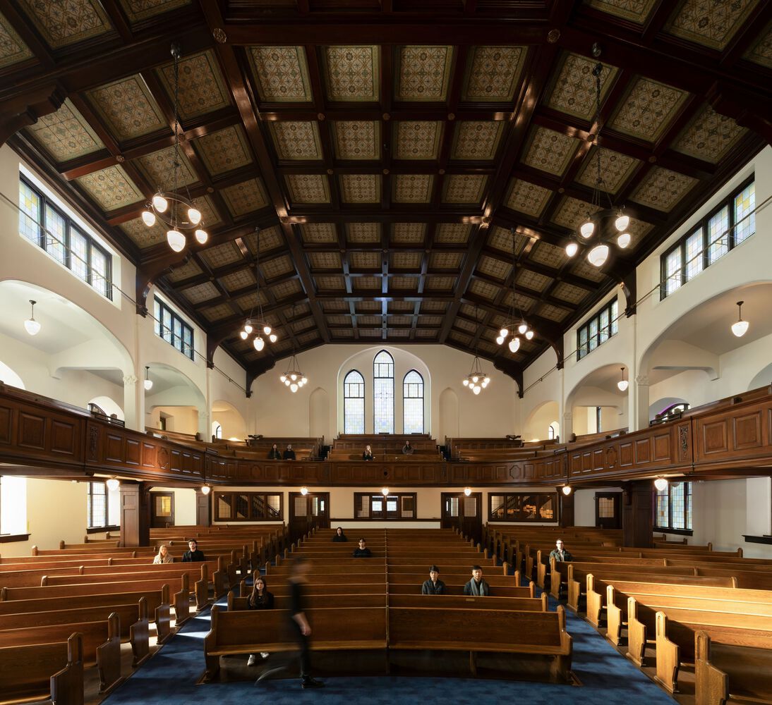 The secondary assembly space, Pinder Hall, was fully reborn. A previous renovation had added a subfloor at the mezzanine level to create additional program space, obscuring the full-height stained glass windows and muting the space's character.
