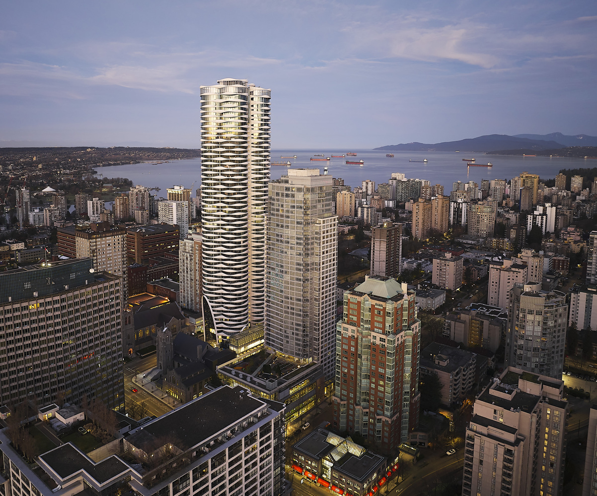 The Butterfly's distinctive form establishes a bold new landmark for Vancouver, gracefully announcing the high point of the city's downtown peninsula and the gateway into its vibrant West End neighbourhood. The tower's unique sculpted façade is achieved with an innovative assembly of insulated pre-fabricated panels, high-performance glazing, and wide-spanning balconies that together provide exceptional performance and enhanced occupant comfort. The dynamic chamfered forms at the tower's base honour the historic building while maximizing the use of its landscaped ground plane.