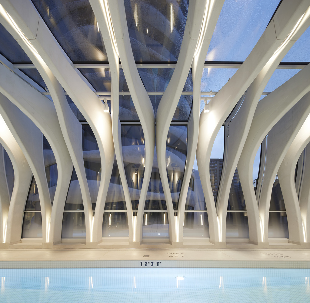 Bridging the tower's fifth level, a 50-meter lap pool offers residents an immersive, almost ethereal experience. Clad in high-performance glazing and supported by 36 prefabricated modular ribs, the pool enclosure integrates and conceals all mechanical, electrical, lighting, and acoustic systems within its form.