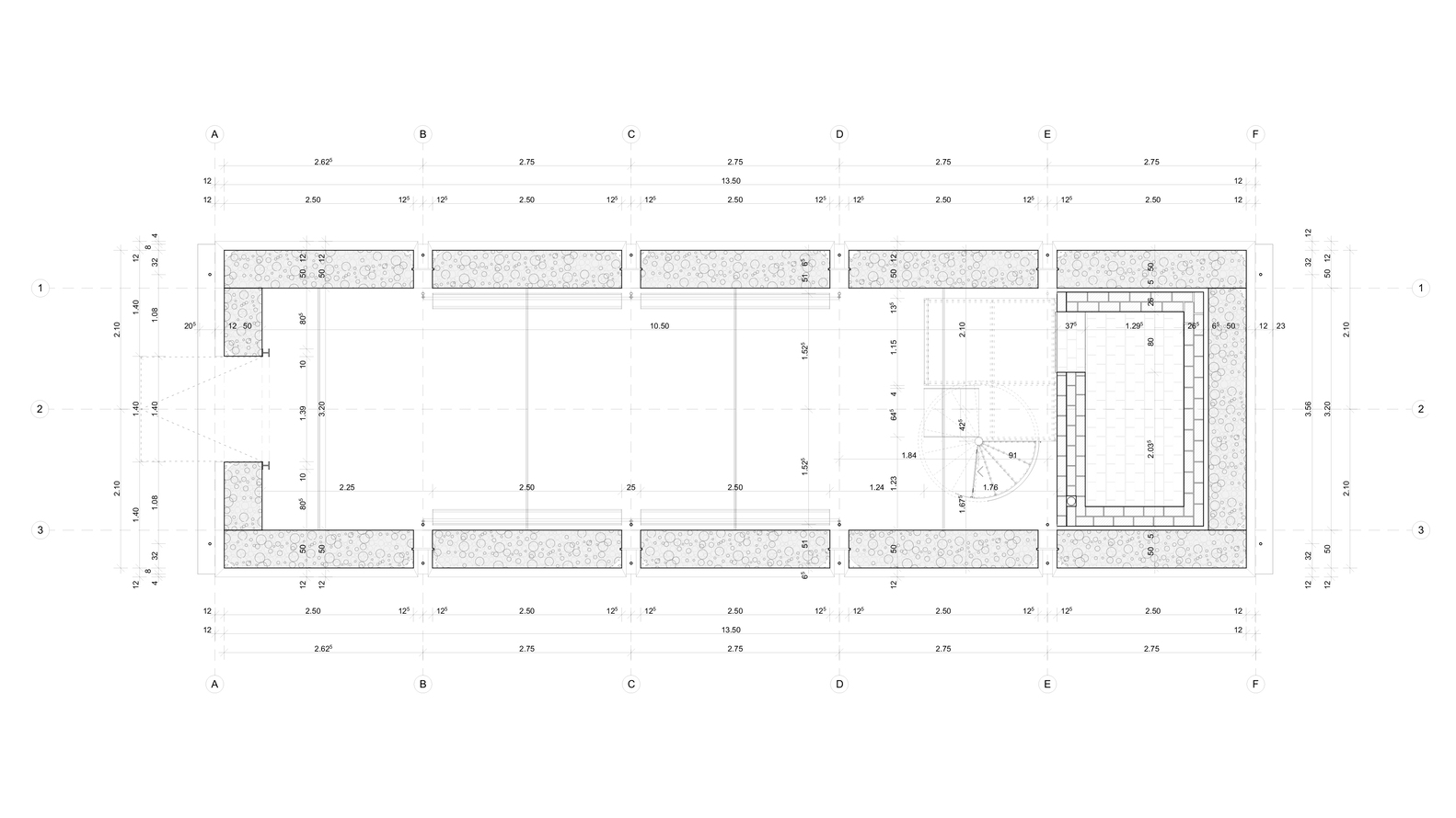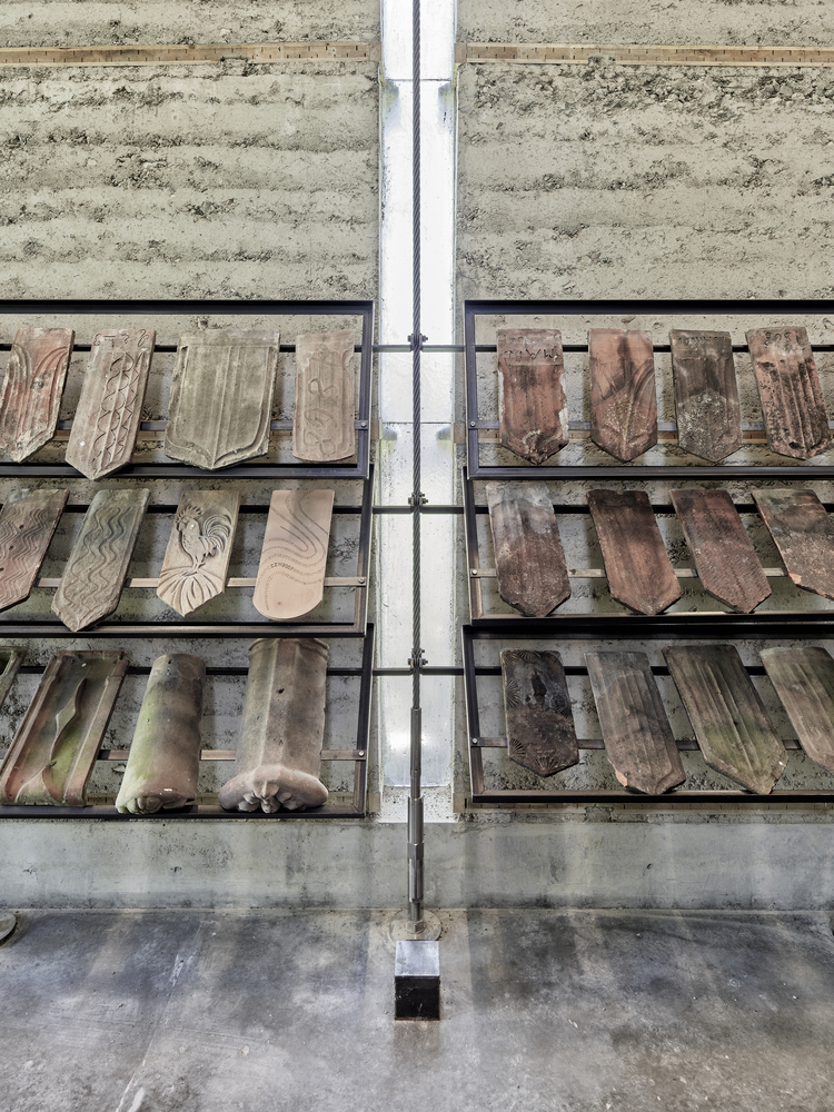 The exhibition room with the adjoining kiln has a solid, stiffening timber ceiling. Its character is defined by the presence of the earth and the monumentality of the concluding kiln wall.