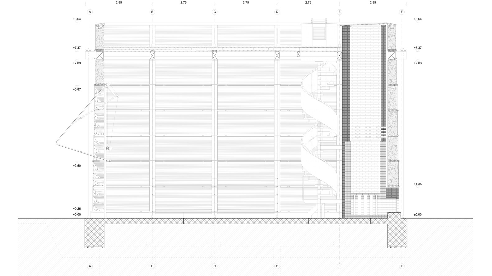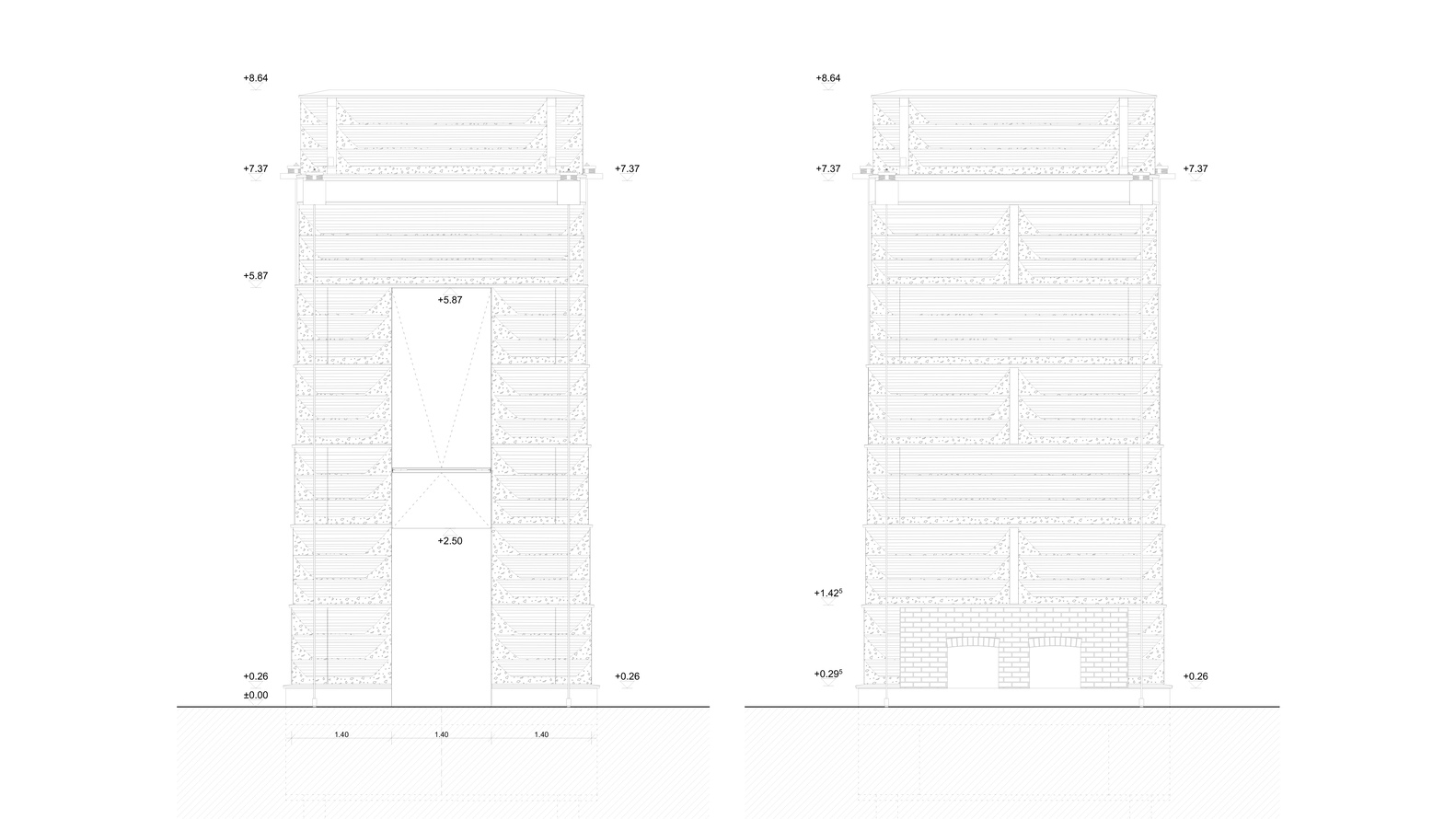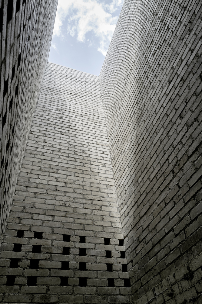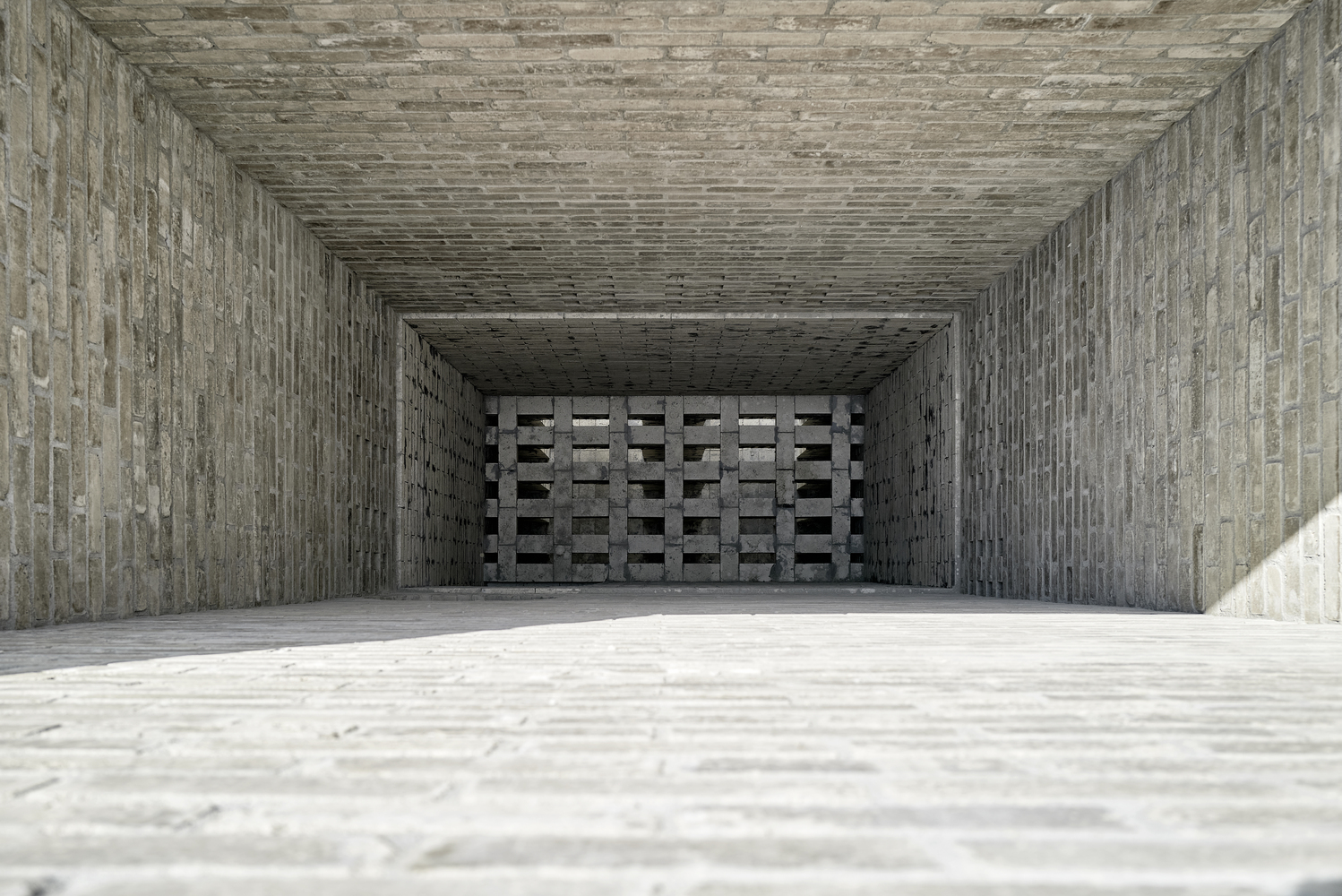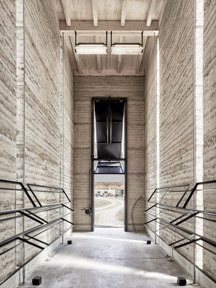 Thanks to the light slits of the open joints, in front of which the prestressing elements run, visitors can experience the whole solidity of the rammed earth walls, that contrasts with the delicacy of the tension bars.