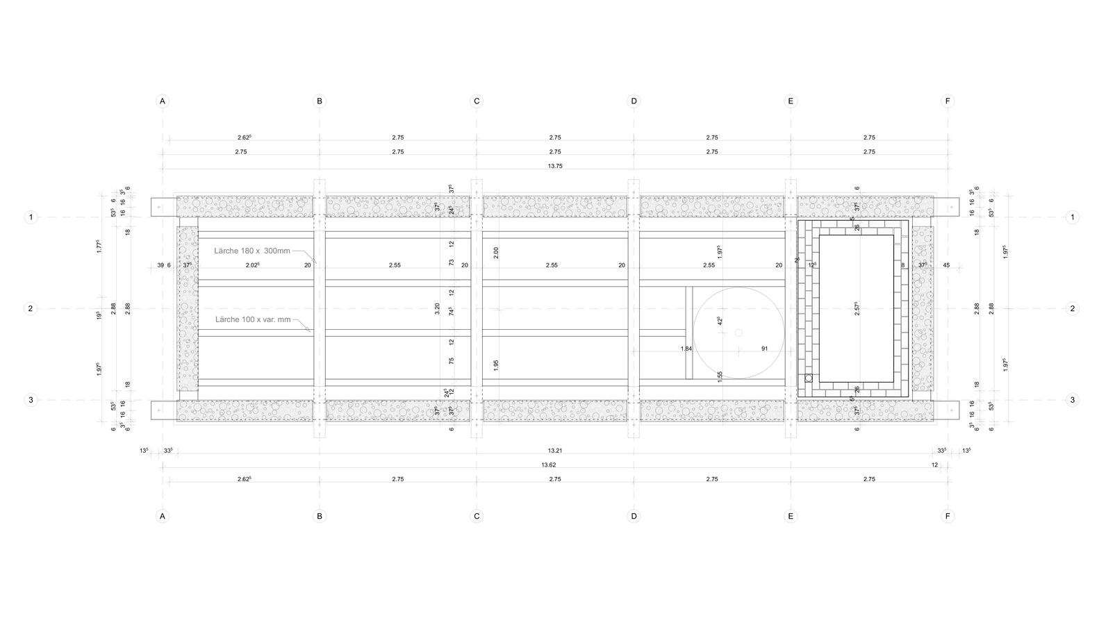 The second innovation is the integration of the timber element base plates into the wall structure. A weather drip is installed on the plates on site to protect the earth from erosion and illustrate the joining principle.
