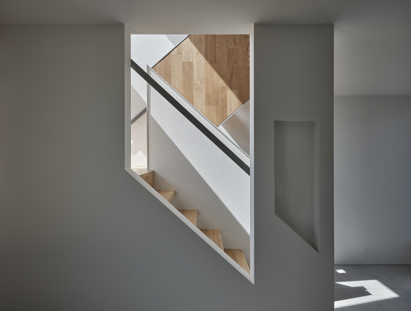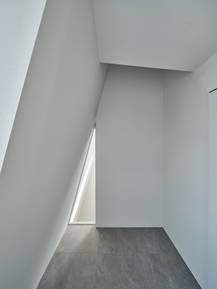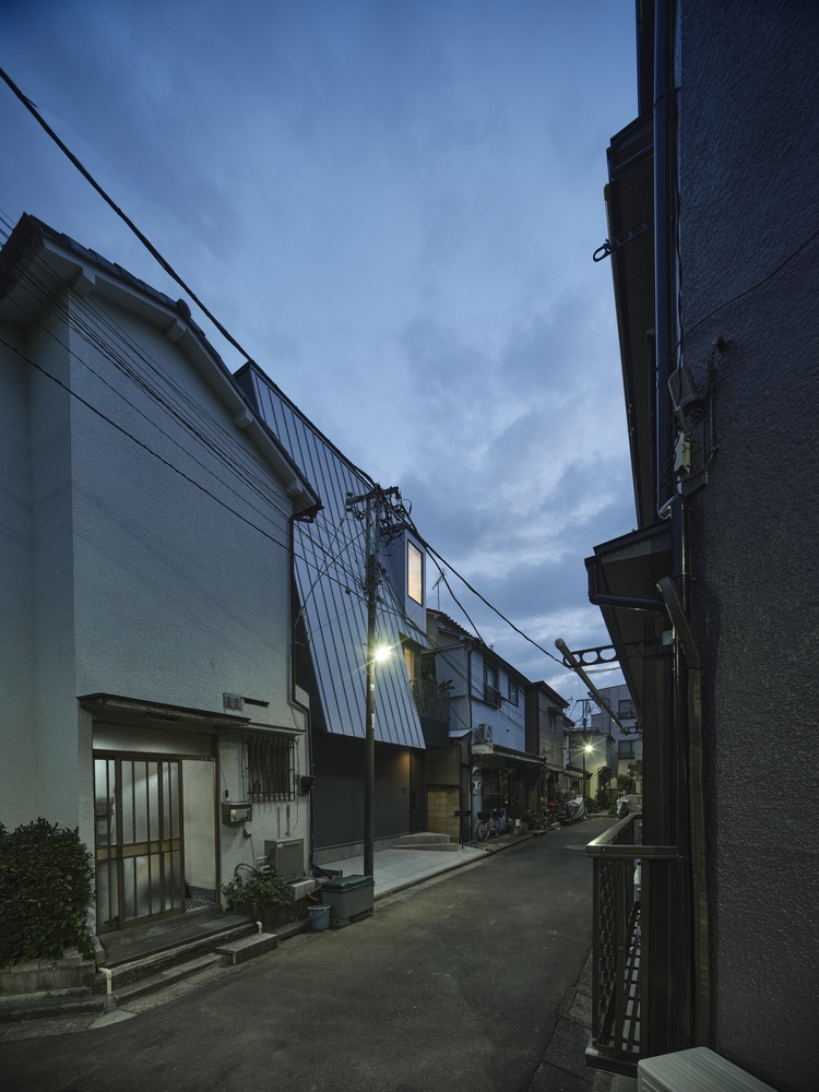 This angled form softens light into the alley and interior, creating a new spatial context within the traditional house-shaped skyline.