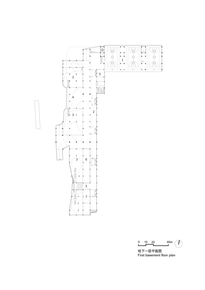 Courtyards within the underground car park bring in natural light and greenery, while some areas double as sports venues shared by students and nearby residents.
