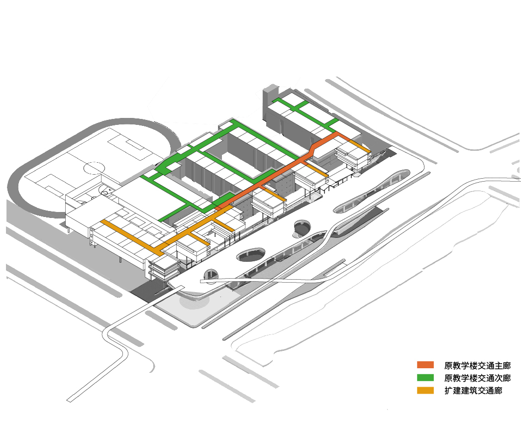 Through this vertical organization, the campus expansion achieves spatial layering within a constrained site, the building spans ground, greenery, and fire lane, establishing a new vertical relationship between educational and urban space.
