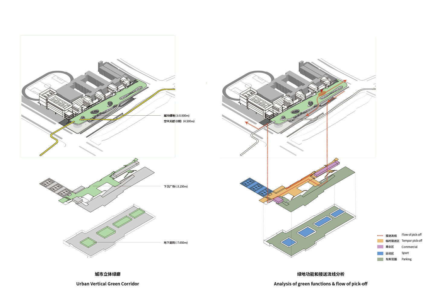 The architects redefined the urban greenbelt as "three-dimensional green corridor" — its upper level for pedestrian and landscape functions, the middle level as a sunken plaza and transport hub, and the ground level as parking and sports facilities.