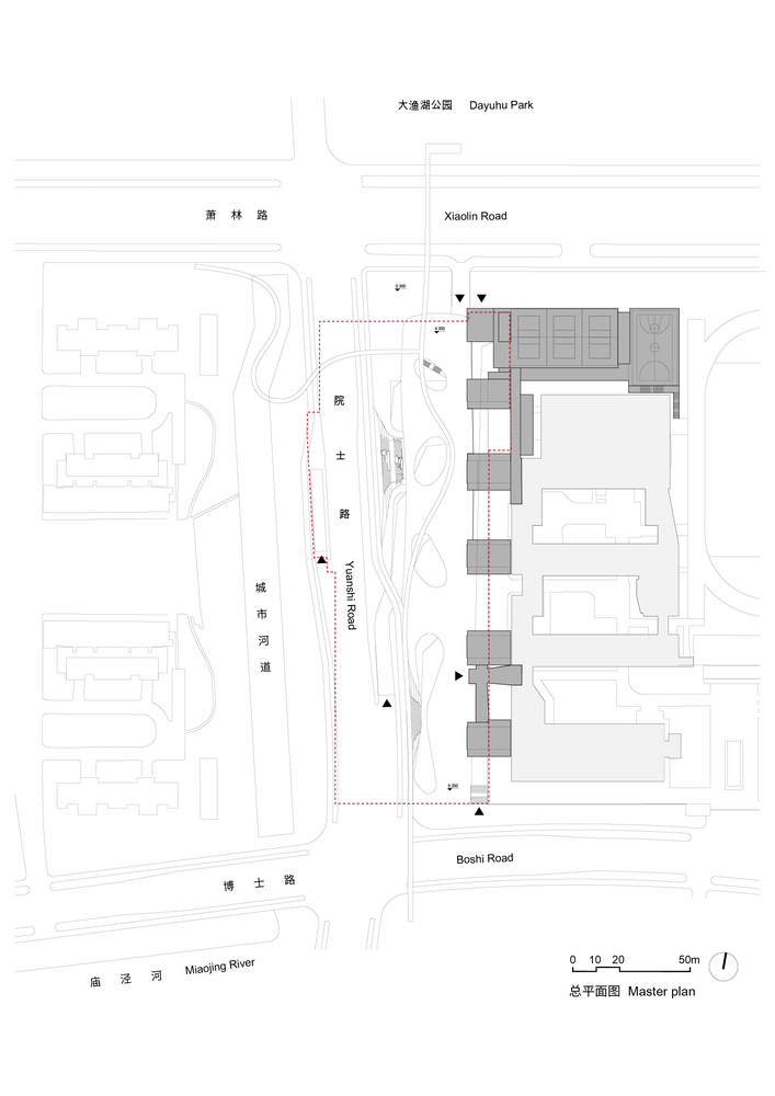 A new west gate was added along the greenbelt, to relieve traffic pressure at the main entrance and organize circulation through layered access between the sunken plaza and the underground garage.