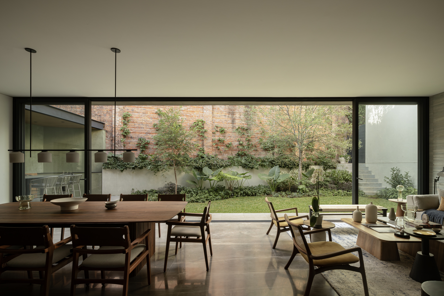 Floor-to-ceiling windows dissolve boundaries between the interior and exterior, integrating the patio and garden as natural extensions of the living spaces.