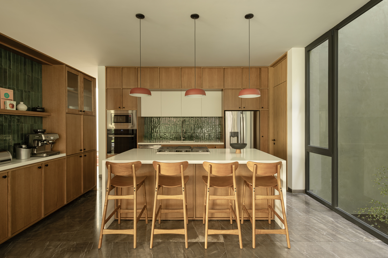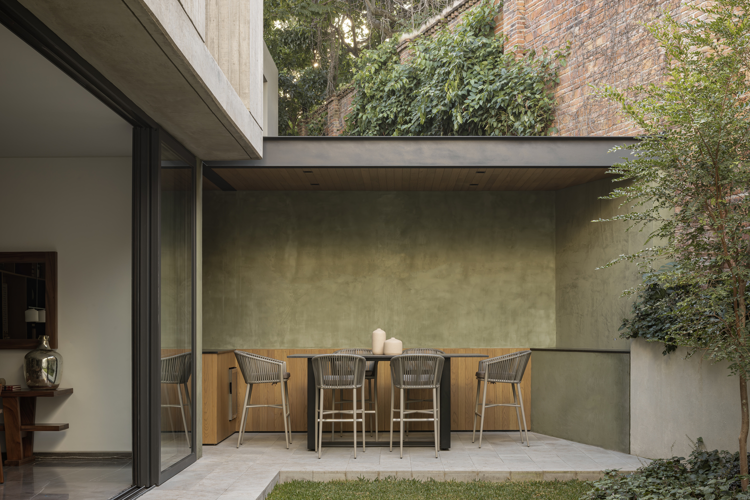 Wood is used extensively to create continuity, while green stucco introduces a subtle yet striking contrast, visually tying the interior design to the surrounding landscape.