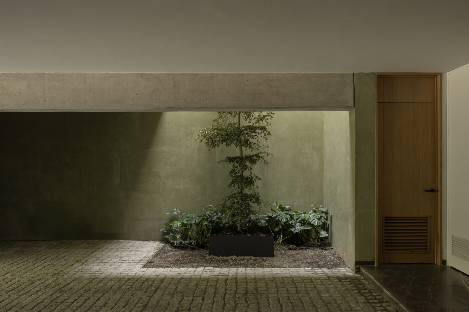 This natural feature introduces softness and establishes a connection to the outdoor environment, offering a counterpoint to the building’s geometric rigor. Inside, the material palette emphasizes warmth and texture.