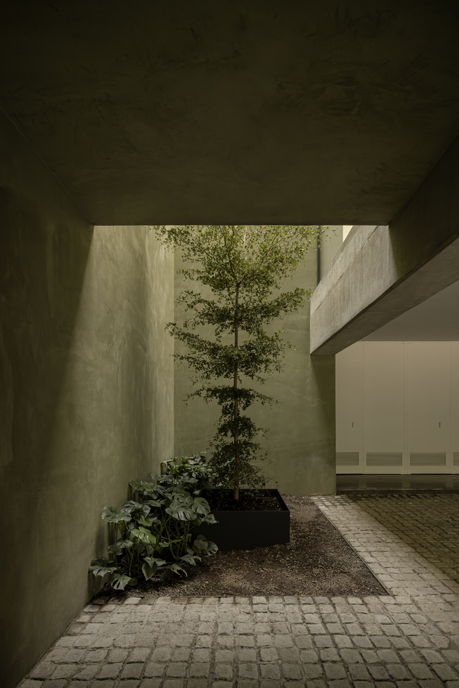 The interplay of light accentuates the textures of the finishes, subtly transforming the interiors throughout the day. The vertical circulation, concentrated in a single core, incorporates a tree as a focal element.