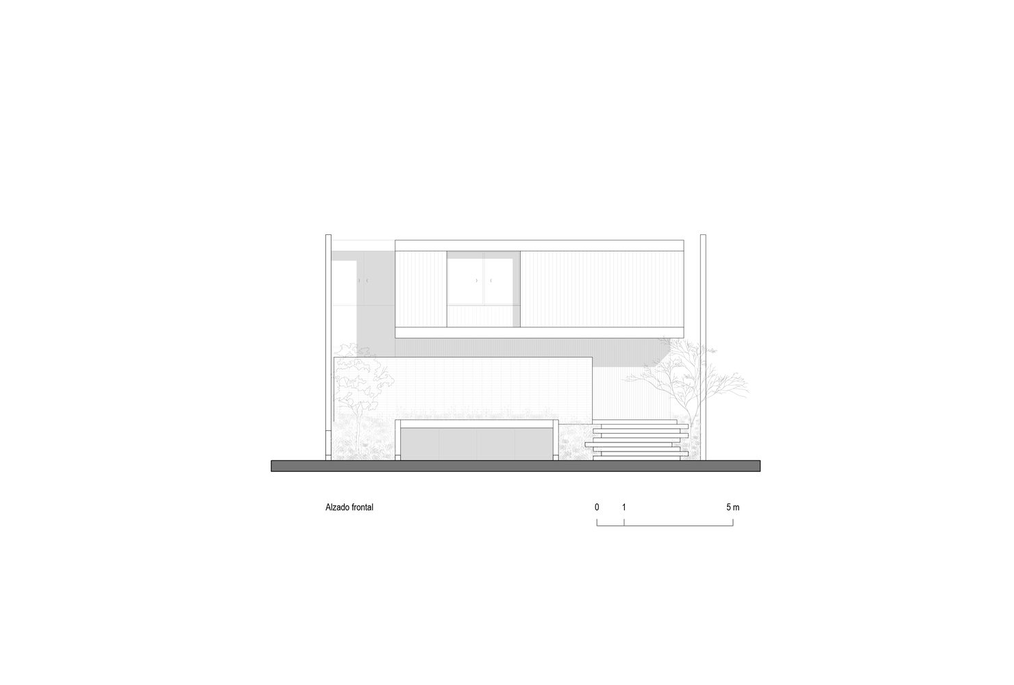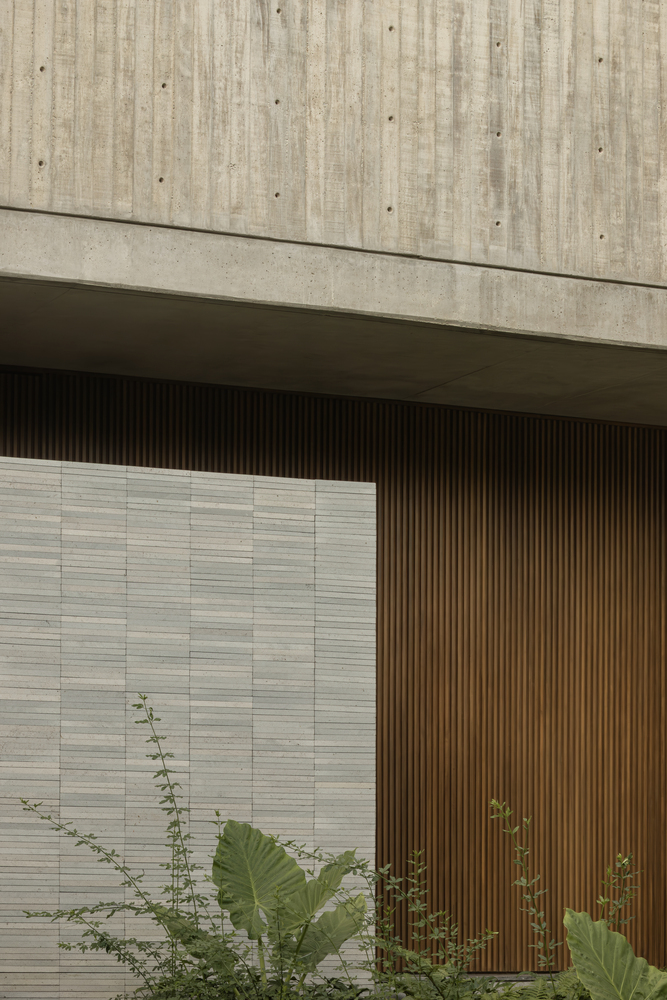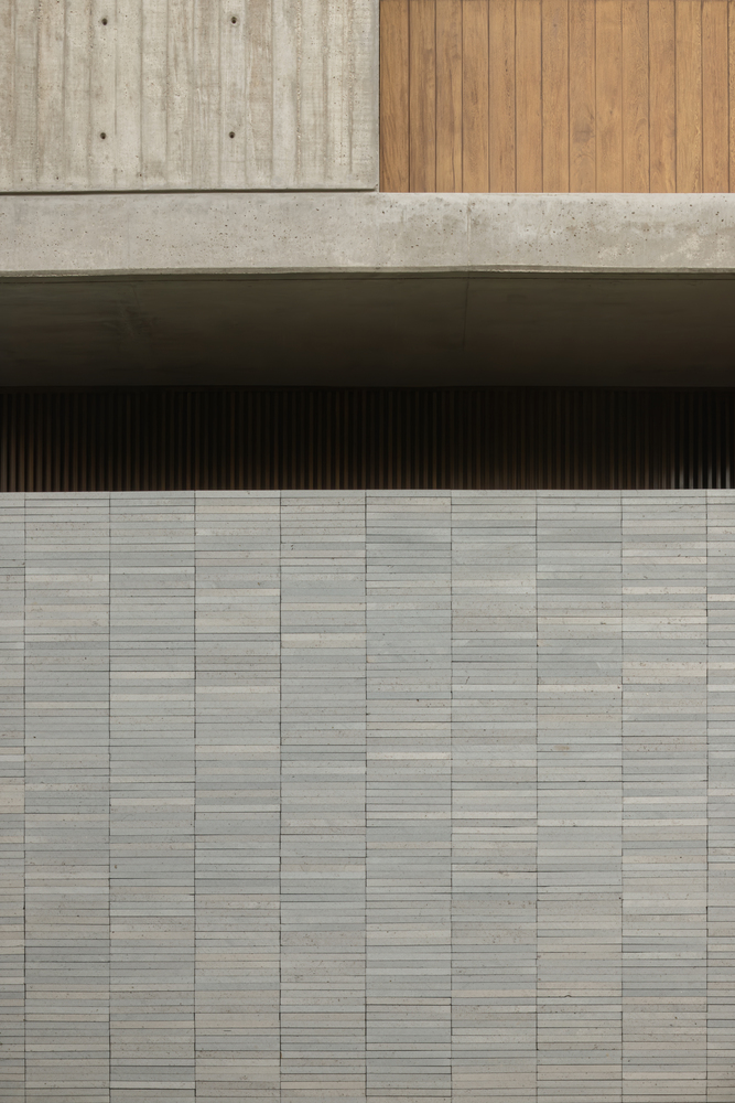 This material contrast creates a layered composition that distinguishes programmatic elements while highlighting the orthogonal design, where vertical and horizontal planes are carefully articulated in both the façade and interior spaces.