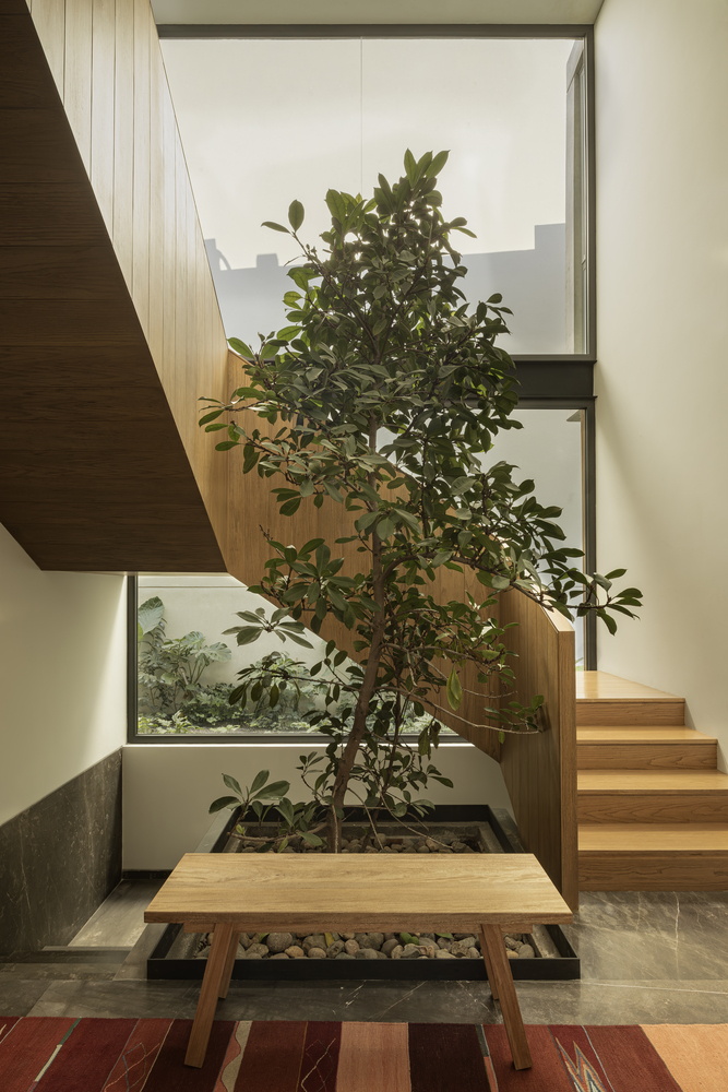 At the center of the home lies an interior patio extending to triple height, acting as a spatial and functional anchor for the project. This void allows natural light and ventilation to penetrate the core of the house, distributing evenly across adjacent spaces.