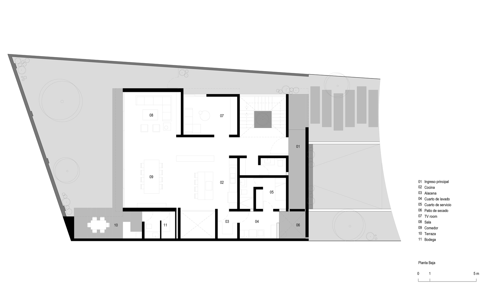Movement through the house is guided by visual axes and focal points, framing elements such as the garden, interior patio, or carefully composed light and shadow.