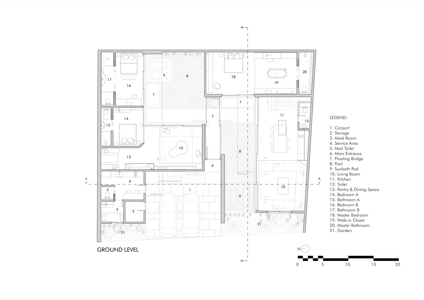 Pools are inserted into the resulting voids between volumes, transforming negative space into visual anchors for both wings.