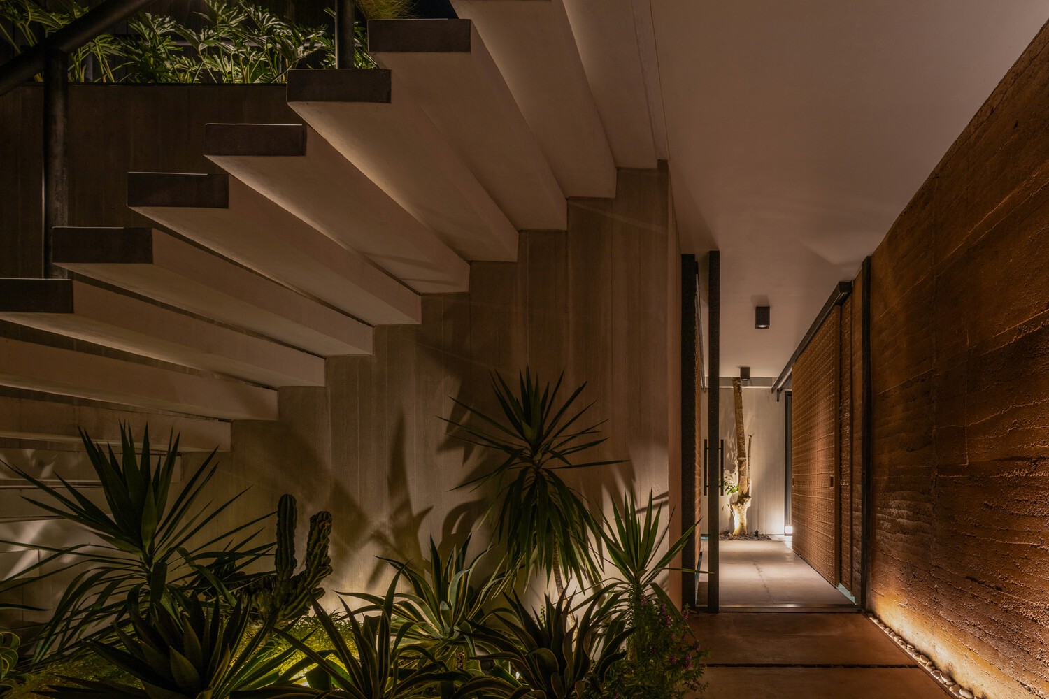In contrast, the upper volumes are clad in charred wood panels. A rammed-earth wall at the entrance provides privacy and anchors the composition.
