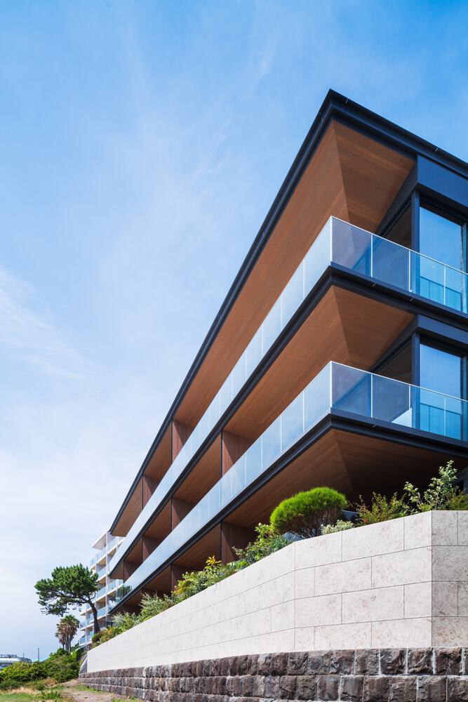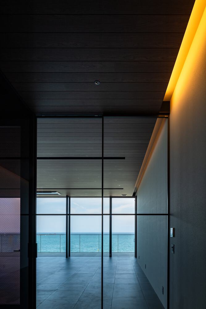 The result is a space that evokes the atmosphere of a hotel lobby. All 17 units face either west toward the sunset or south toward the promontory of Morito Shrine, and each features a lanai with a span of up to 2.7 meters.