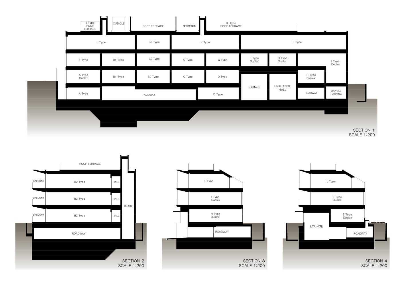 Each unit presents a minimal exterior defined by deep brise-soleils and partition walls. The use of flat slabs allows for the elimination of dropped beams, resulting in a clean timber-panelled ceiling plane.