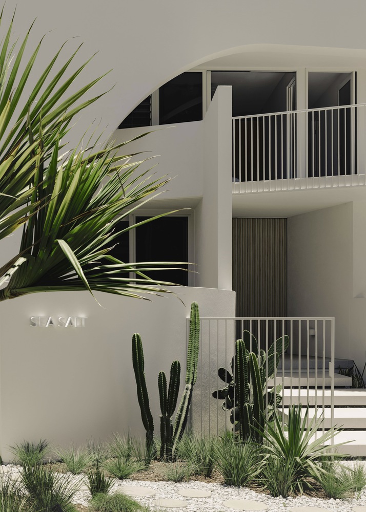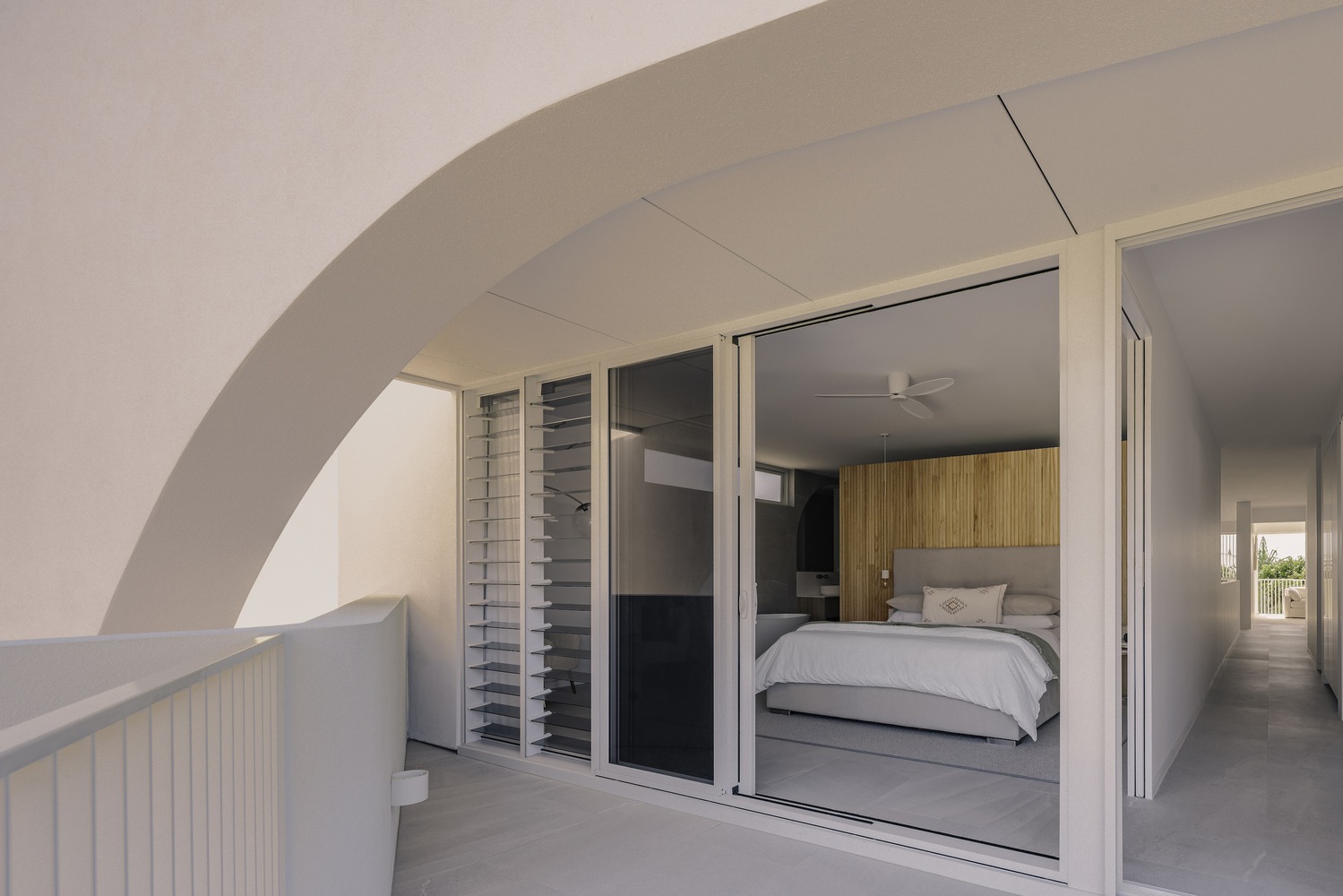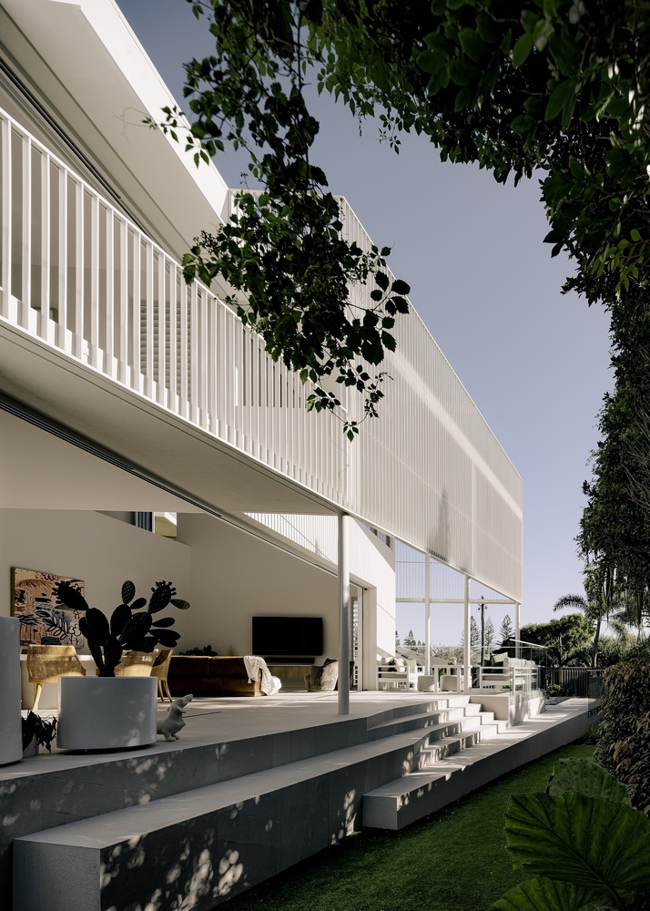 The use of white vertical blade handrails both externally and internally blurs the inside and outside zones, adding to the overall aesthetic of the house.