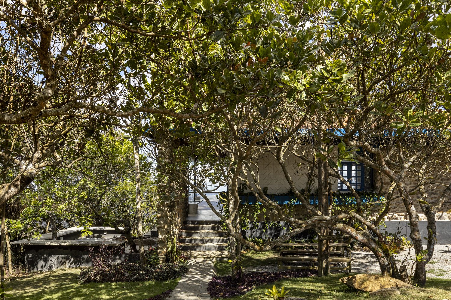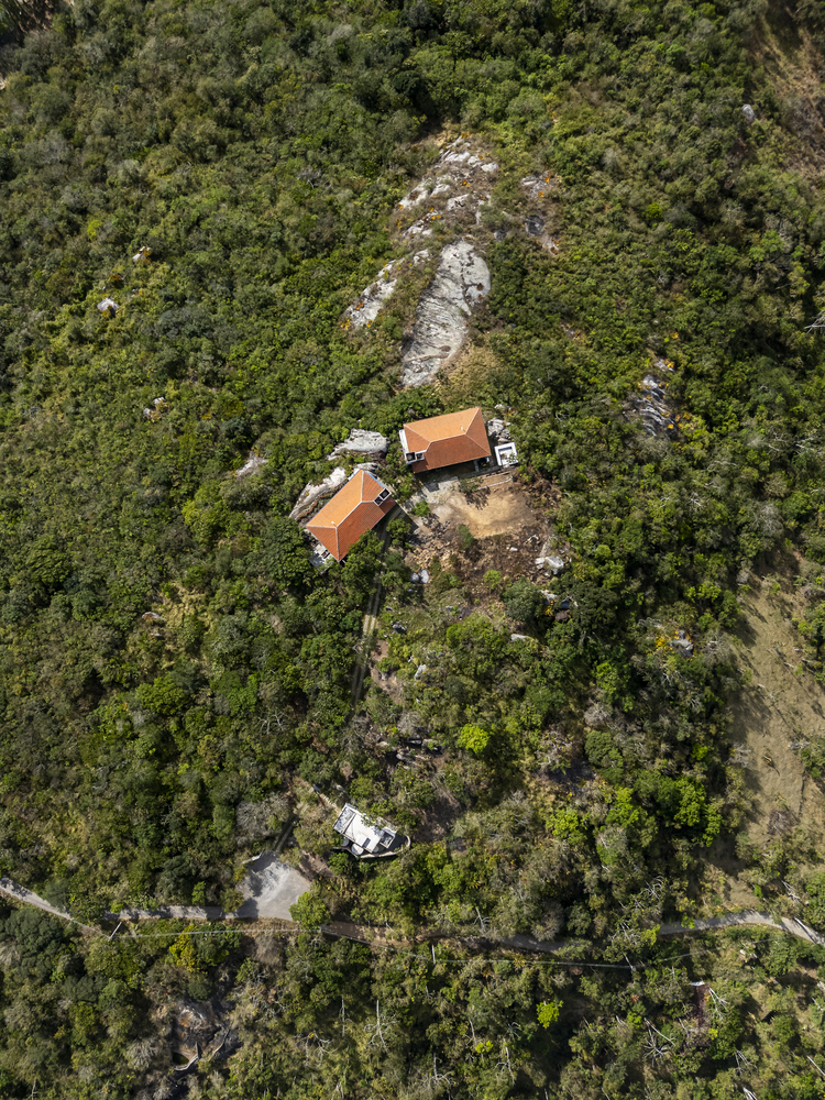The first challenge of the project was to create access to the houses without removing any trees. Thus, a winding little road emerged that traverses the land from the gate, always avoiding the existing vegetation. Of the four units planned, two were built.