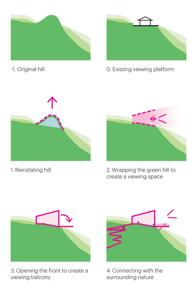 MVRDV's design started from the revelation that the hill was flattened during the construction of the pre-existing viewing platform.