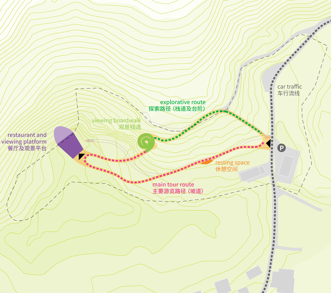 The design also improves the path network to add multiple routes to the viewpoint, including by adding a secondary viewing platform incorporated into a twisting staircase structure.