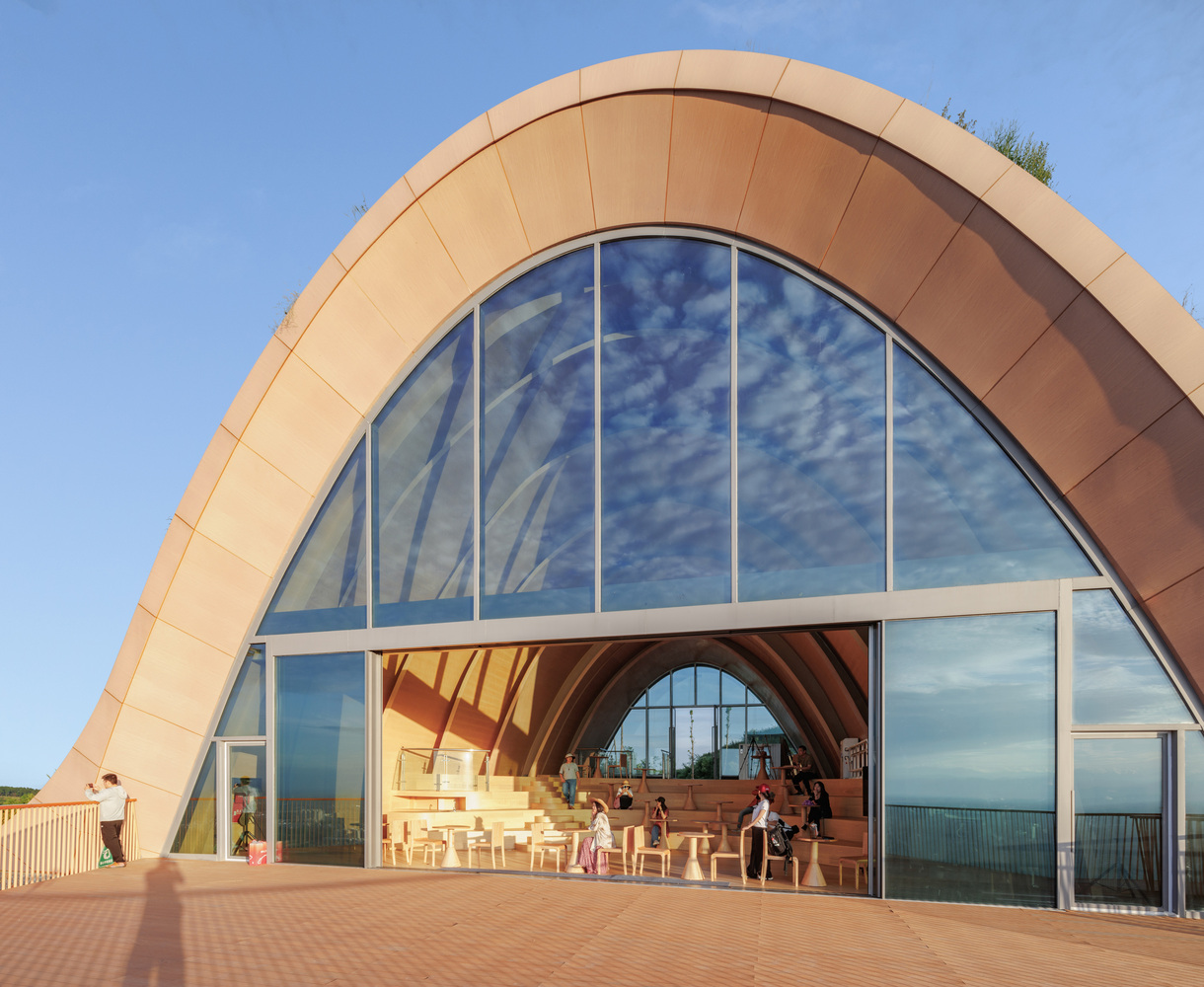 Designed to blend into nature while also standing out as a beacon when seen from the plains below, the structure of earth-covered timber arches takes a telescopic shape, drawing visitors to the expansive viewing window and balcony that projects out over the slope.