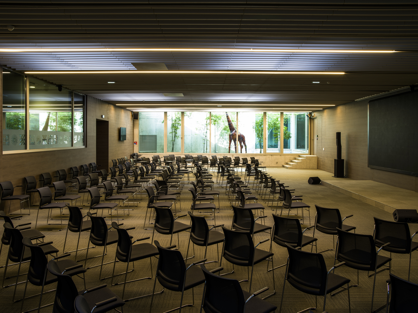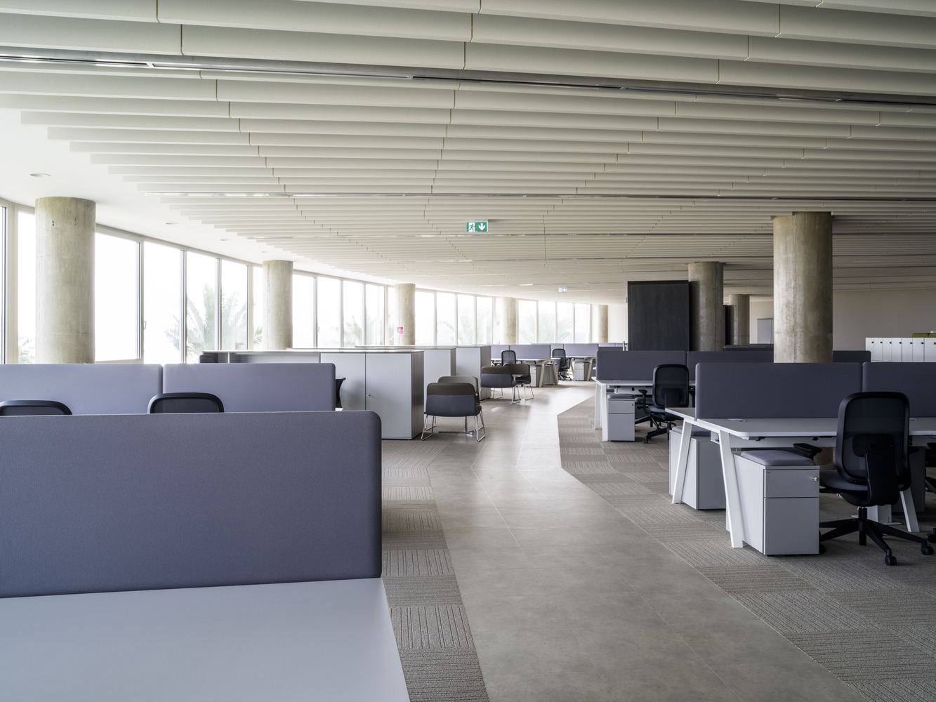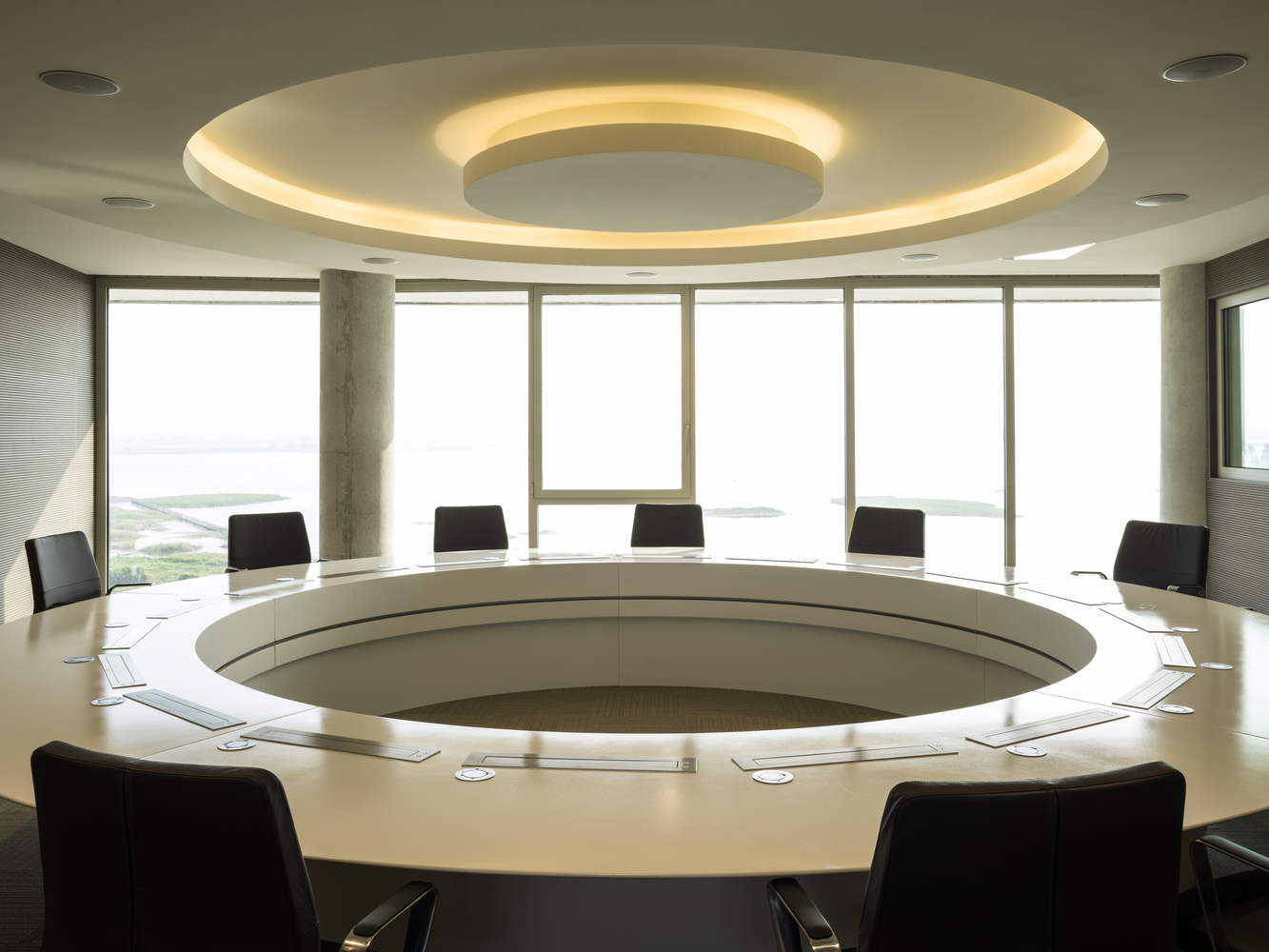 The top floor of the headquarters, with a breathtaking view of the lagoon shore, houses the offices of the top management. The quality of the concrete walls led the architects to directly expose the rough-cast concrete structure.