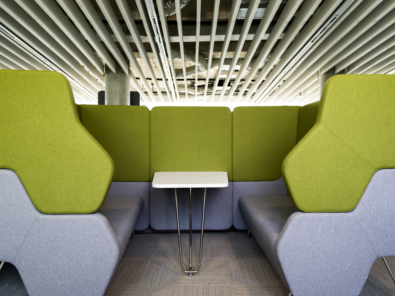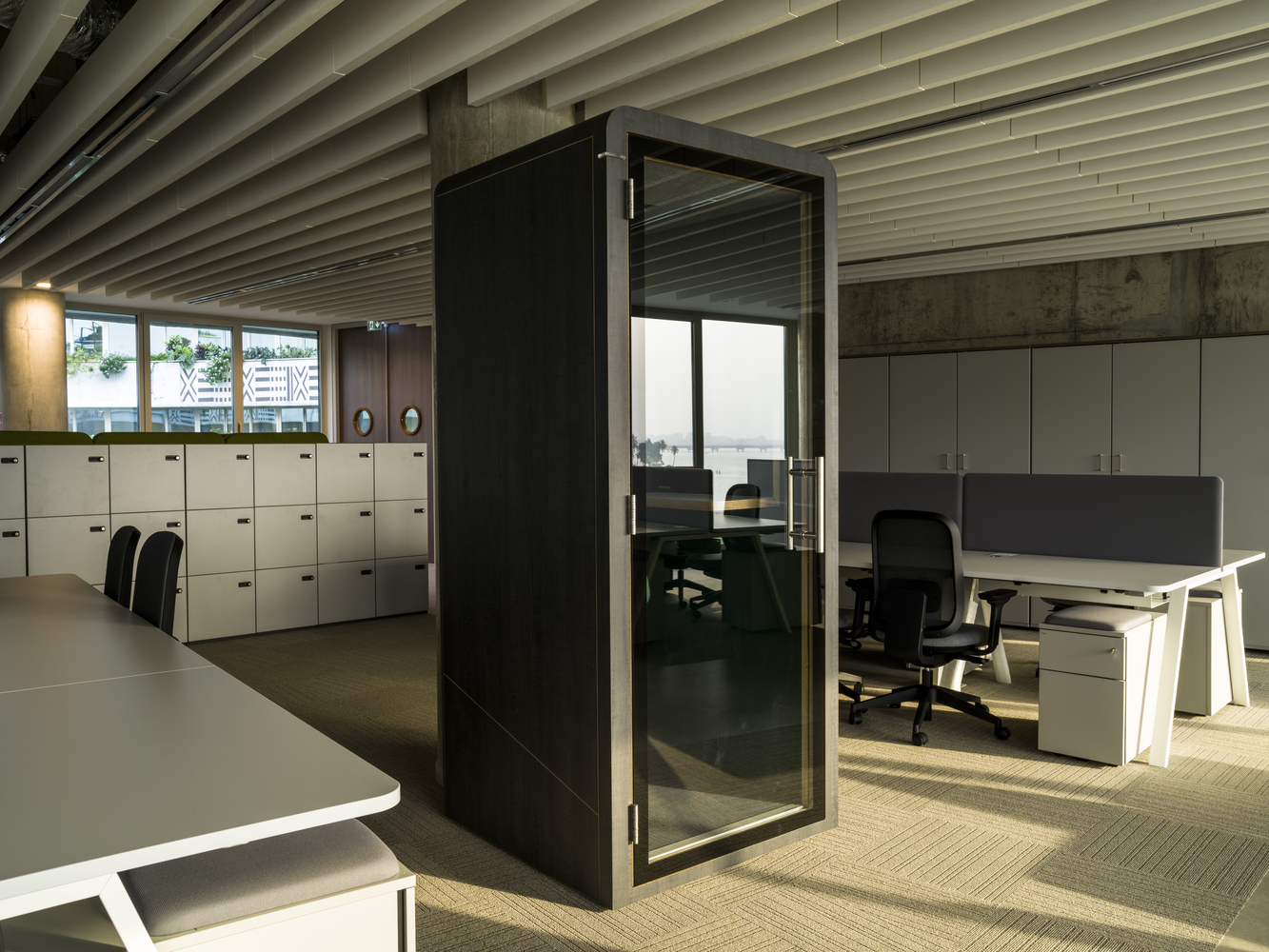 On the upper floors, workspaces are divided between individual offices, small meeting rooms, and large co-working spaces (with private areas specifically designed for small group meetings or individual cubicles).