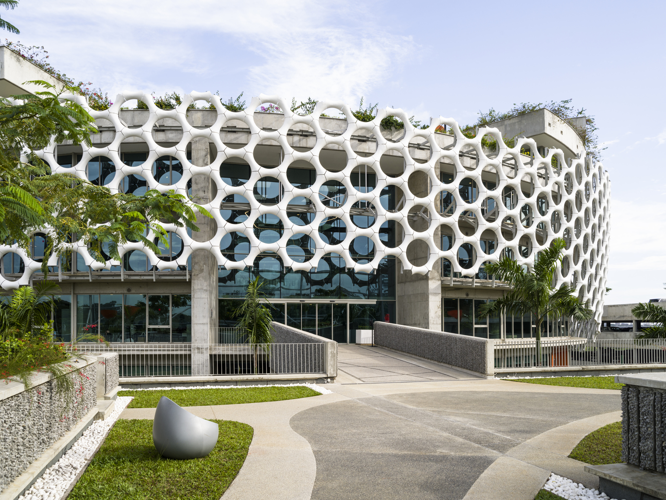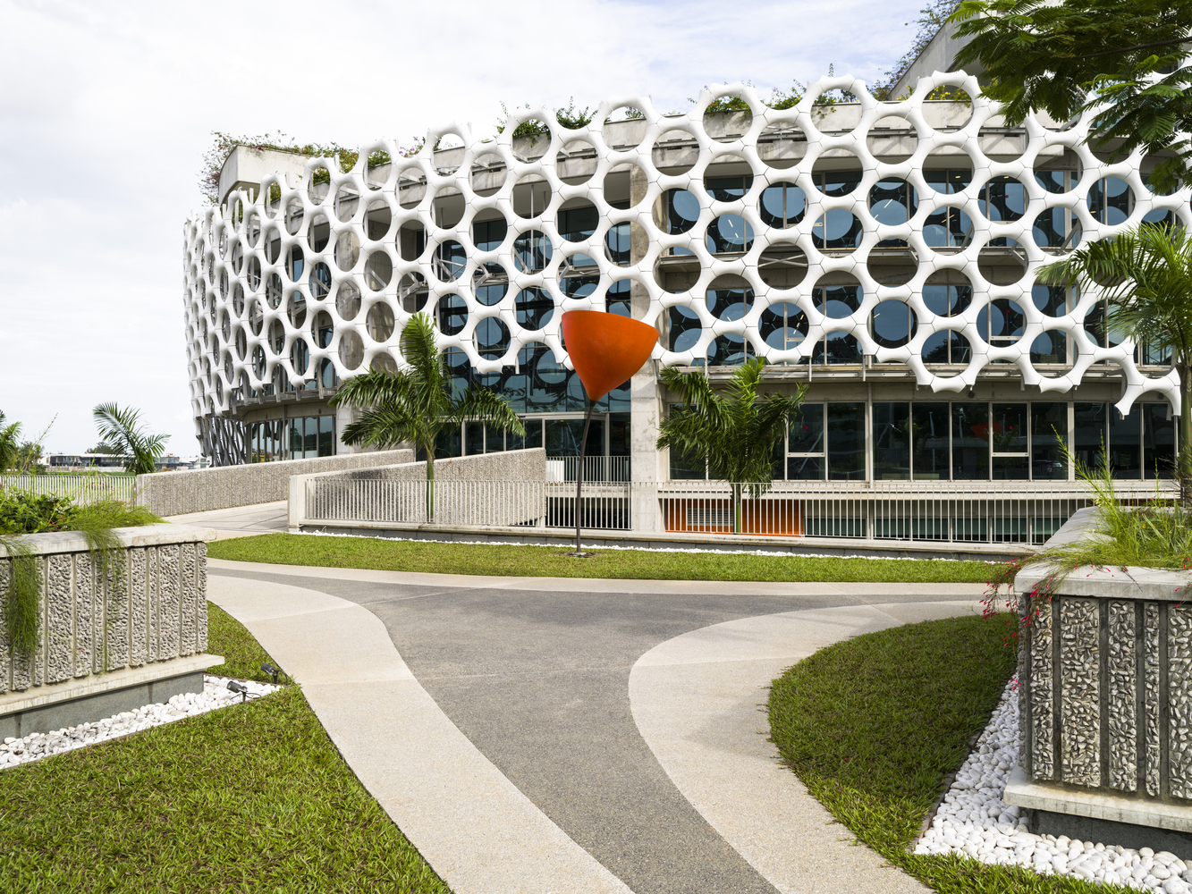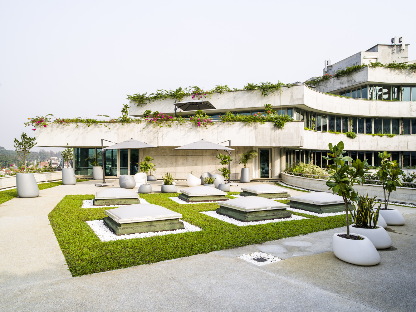 With its variable and tiered levels designed with respect to local urban planning regulations, the three-story building on the main entrance gradually rises to reach a five-story level on the lagoon side.