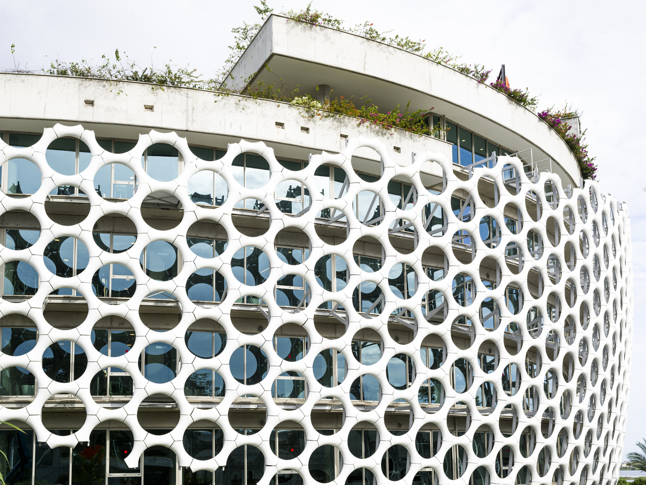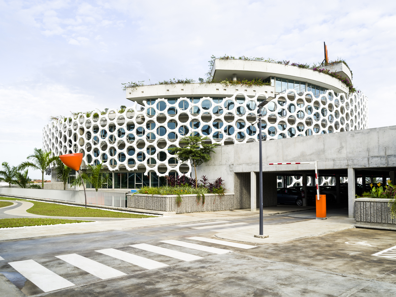 With a double skin holding both thermal and aesthetic functions, the new Orange Côte d'Ivoire headquarters is innovative in its shape, suggestive of a golf ball, a subtle reminder of Abidjan's renowned Riviera golf course.
