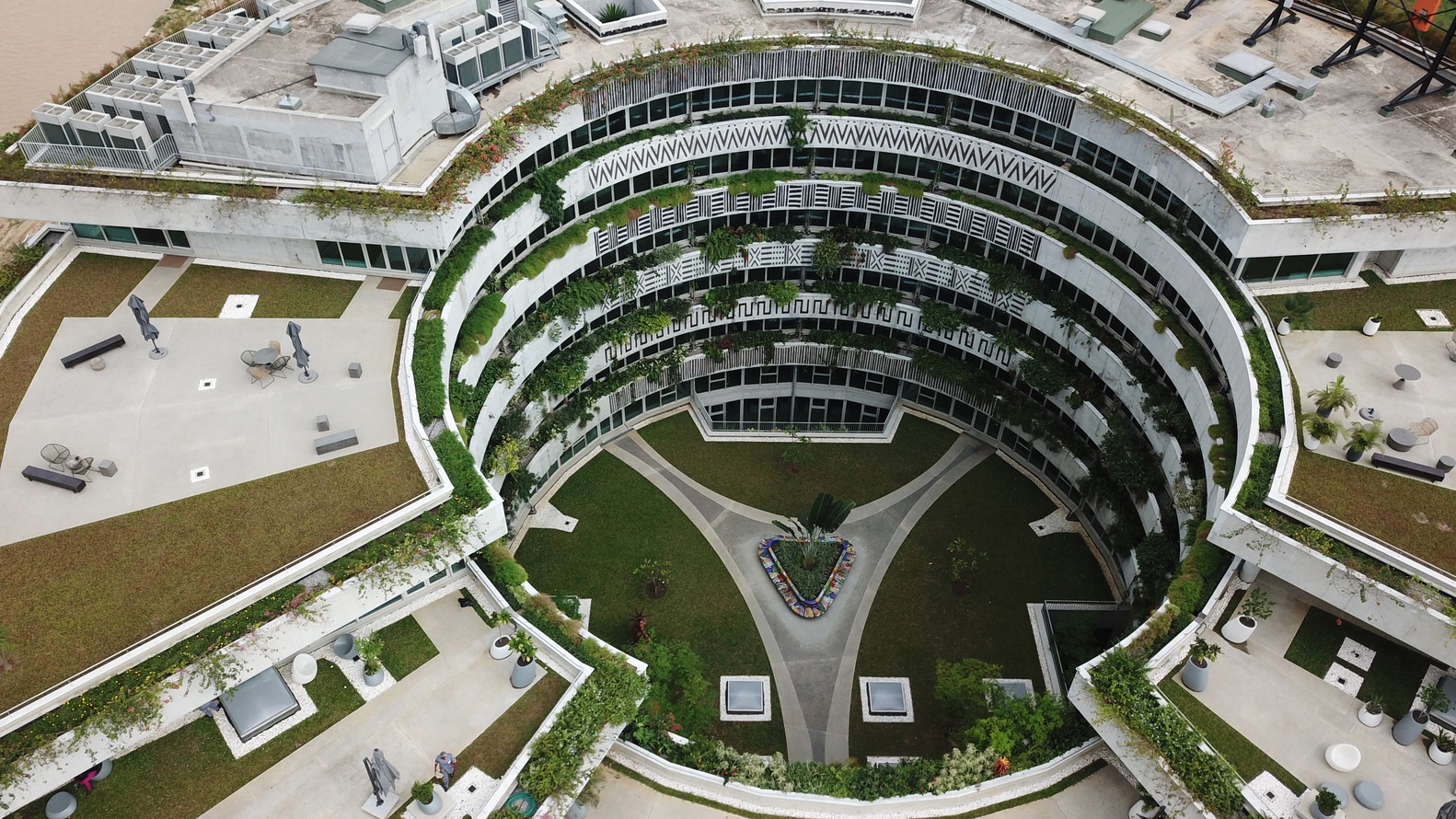The added extensive greenery on the roofs and fences also contributes to the building's integration with its immediate surroundings.