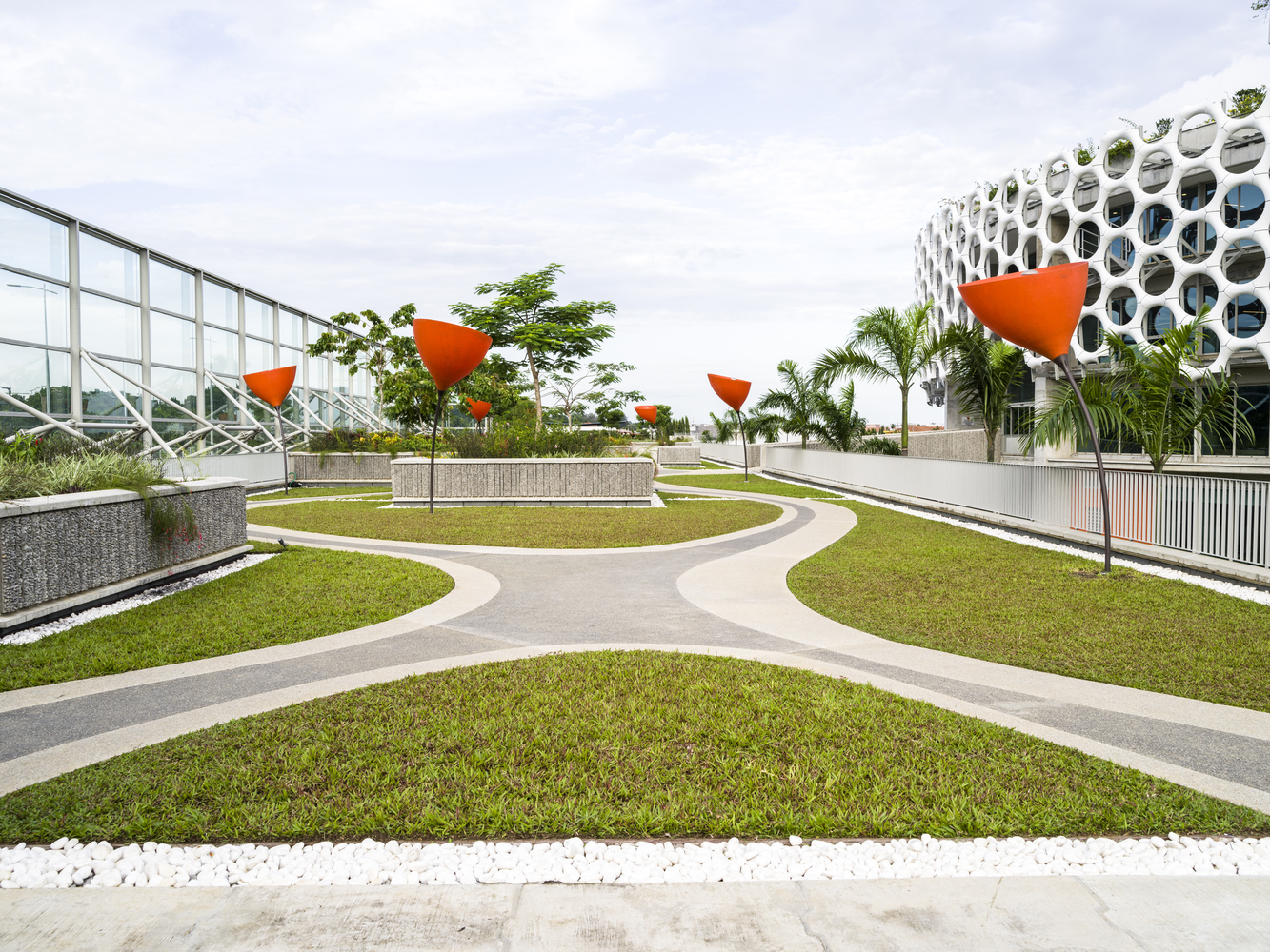 Orange Village seeks, through the design approach, to highlight the urban landscape of Abidjan, becoming a reference building that structures, organizes, and sheds light on the Riviera Golf neighborhood's urban master plan park.