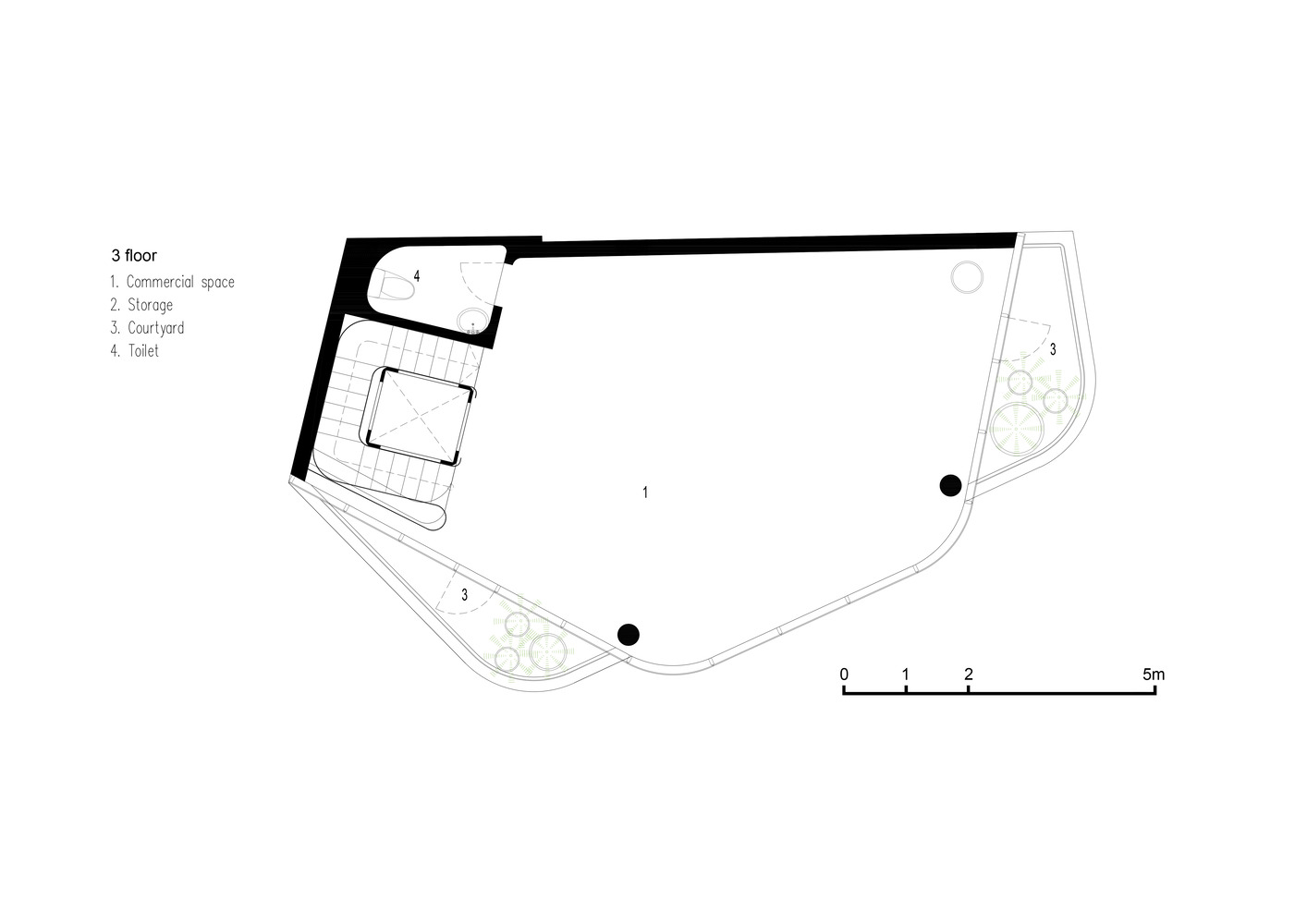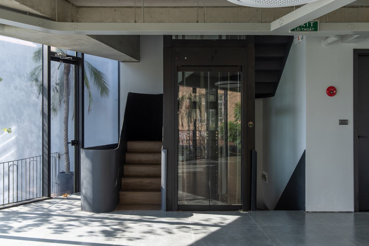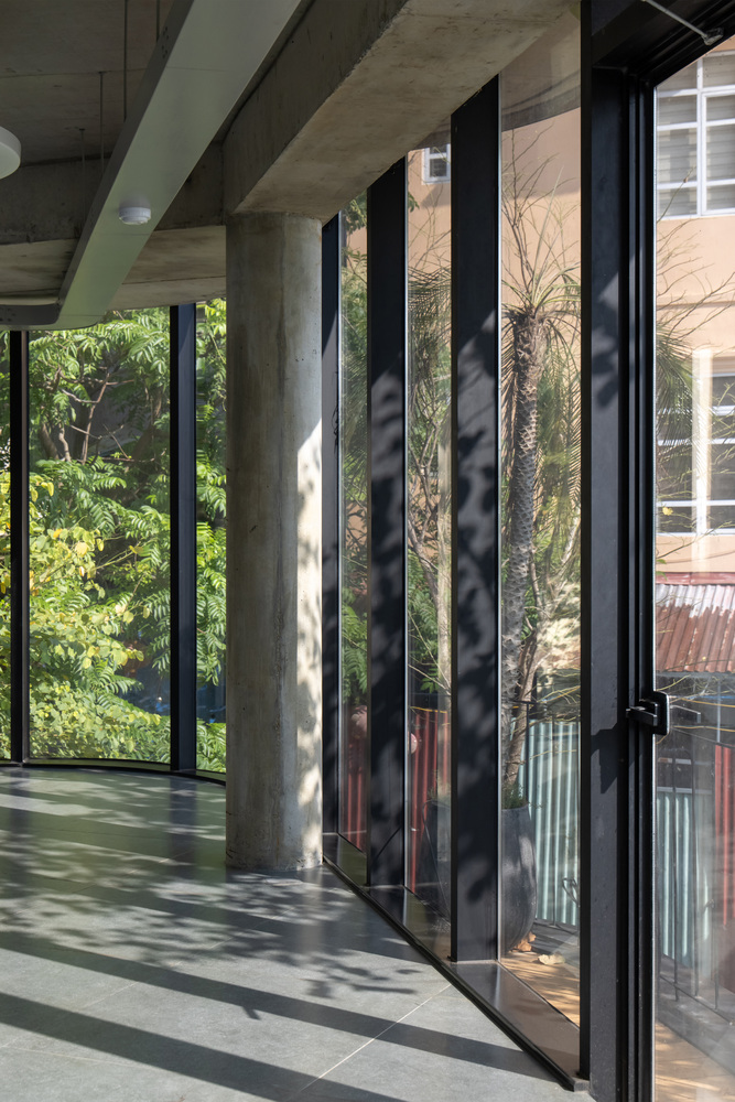 At ground level, a soft transition space is created through a wooden terrace, greenery, and a setback from the public walkway. This creates an inviting threshold where pedestrians can pause, observe, or interact with the activities inside.