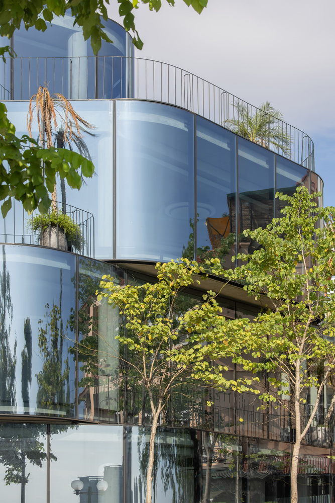 The architectural gesture begins with the idea of transparency and reflection. A continuous curved glass façade wraps the building, softening its volume within the dense urban fabric.