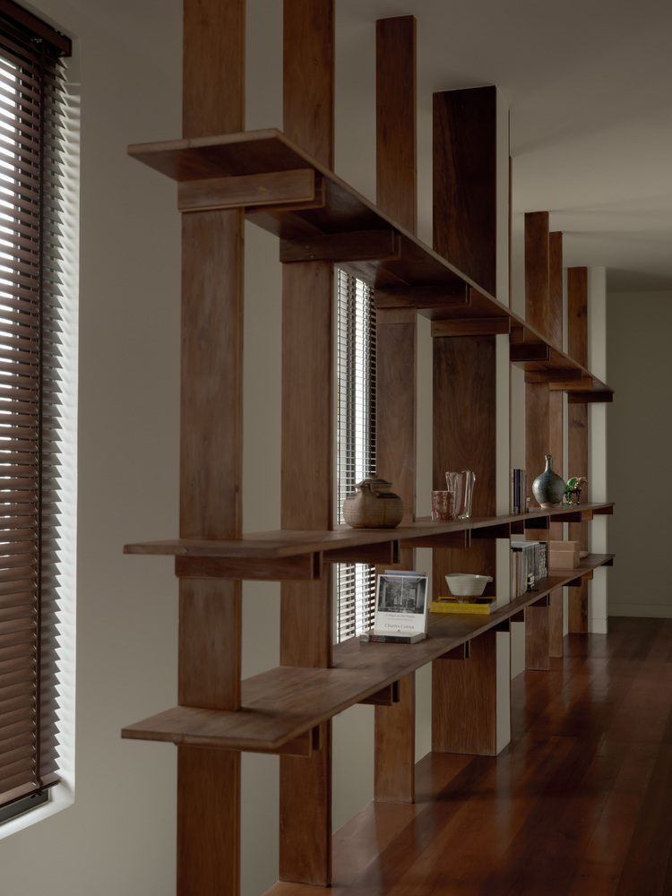 Though its structure is formed from ordinary brick and concrete walls, the character of the home comes from its timber floors, round columns, windows, and reclaimed vintage doors sourced from an old school.