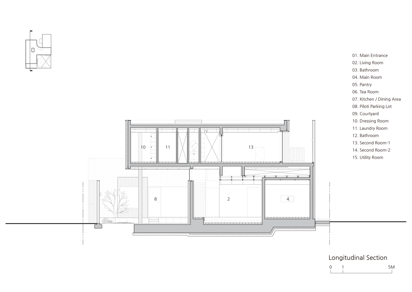 The house presents a critical view of typical residential patterns, such as entrance control centered on the front door, fixed uses of spaces, and upper structures relying on the substructures found in numerous houses.