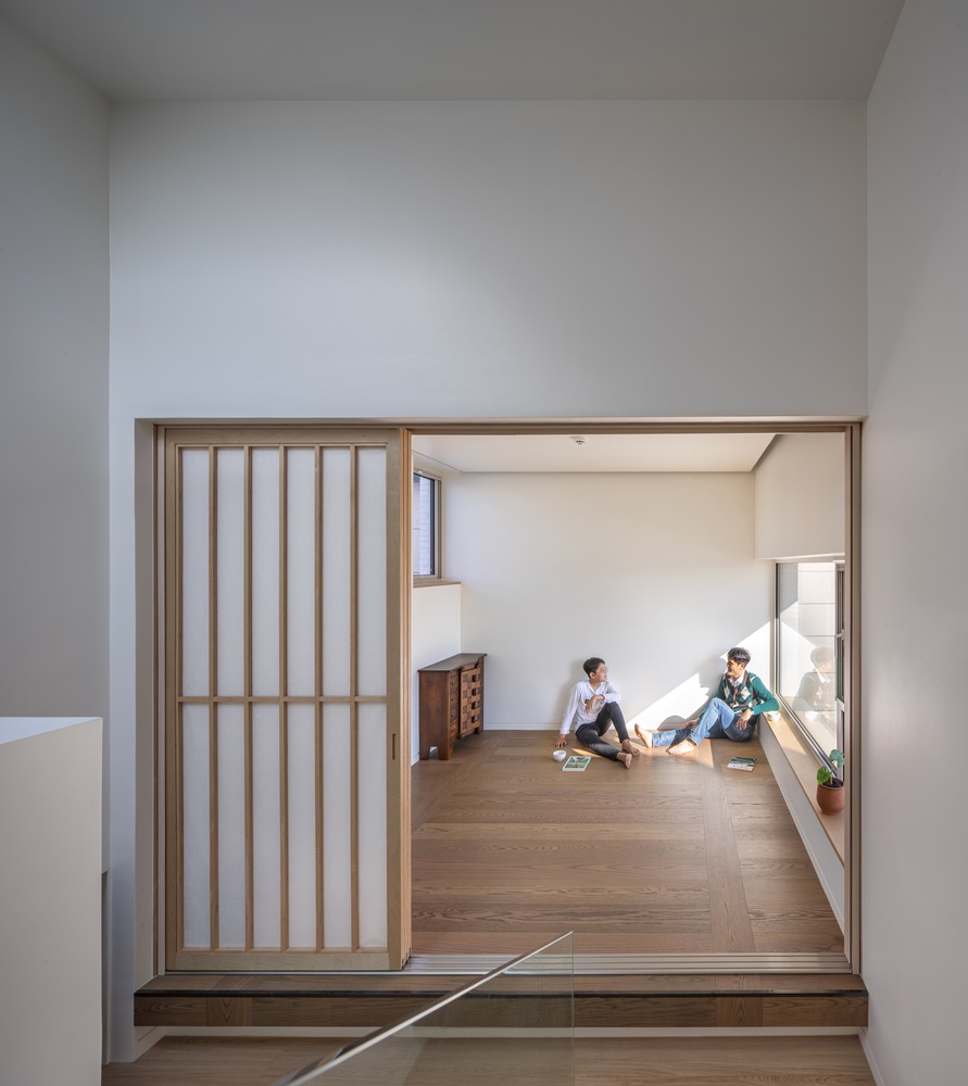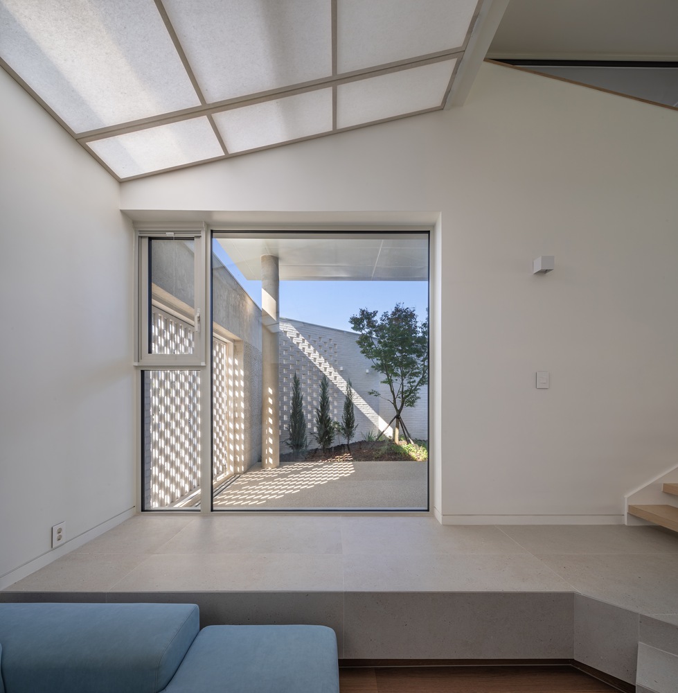 The living room ceiling has a double structure using translucent polycarbonate and traditional Korean paper, hanji, to let in the diffused natural light.